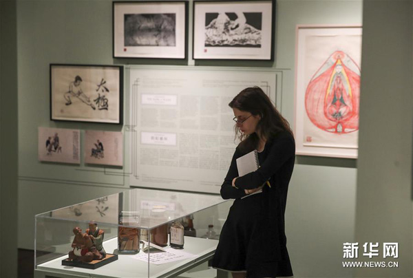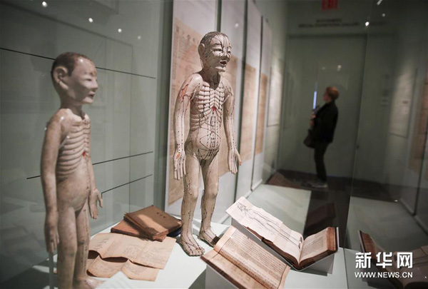 4月25日,在美国纽约华人博物馆举行的“中医在美国:理念、人与实践的融合”主题展媒体预展上,观众观看展品。美国华人博物馆25日首次推出反映中医中药在美发展历程的大型展览。展览从26日起对公众开放,并将持续至9月9日。新华社记者王迎摄
