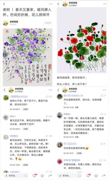 “宫殿君”之外,还有许多带有“中国风”的内容也在网络上走红。例如,头条号作者“老树画画”通过“国画+小诗”的方式让人了解到传统书画与文字的美。由于作品清雅别致,评论区不知不觉形成了“尬诗”风潮,“老树画画”发布的每篇文章下都有成百上千人前来“斗诗”。网友们根据画作即兴发挥,不仅有充满幽默感的打油诗,还有一些诗押韵合辙,堪称佳作。也有一些网友评论“这应该是最有文化的评论区了”、“不会作诗都不敢来评论”,不禁让人感叹高手在民间。