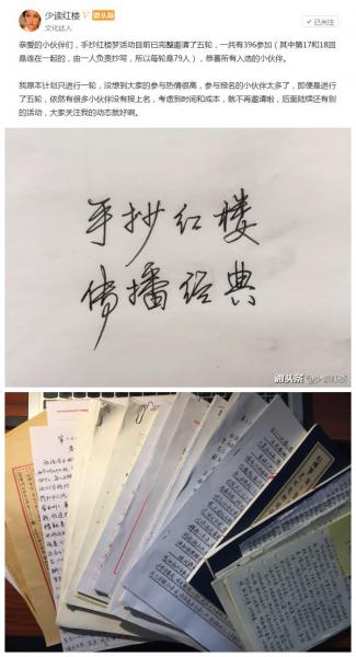 不仅高手在民间,传统文化的忠实热爱者在民间更比比皆是。头条号作者“少读红楼”无意间提起,想找八十个“铁杆红迷”,每人一回抄写《红楼梦》的前八十回。这一提议被众多网友关注,本来只需八十个人,结果却因报名人数太多延续了五轮,仍有众多人没能参与进来。参与进来的网友纷纷留言称,“越抄越有感触”、“活动很有意义,传承经典”,还有一些网友带着孩子一起手抄红楼,他们认为这样的形式“既练习了书法,又了解了经典作品”。