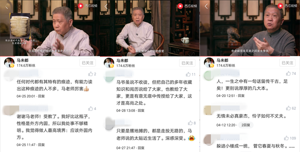 在今日头条上,另一位重量级人物——收藏大师马未都通过视频将国宝、古典文学、民俗的故事娓娓道来,为大家普及了众多关于传统文化的知识,受到170多万粉丝的喜爱。此外,中华好诗词、CCTV国家记忆等节目也在西瓜视频上发布相关视频,借助新的传播形式展示传统文化。