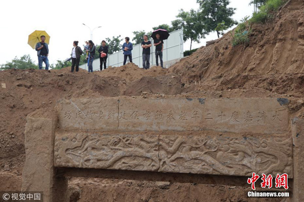 5月21日,山东滨州一建筑工地施工时挖出一座古建筑。经初步鉴定,该建筑为清朝嘉庆十二年间修建的一座贞节牌坊,高约4米,宽约6米,前后共有6个石狮子,牌坊上雕有龙形花纹,两侧还有一些残余青砖,最上部刻有“大清嘉庆十二年旌表节孝侯廷对妻赵氏坊”字眼。工地挖出古建筑的消息瞬间被传播开来,许多当地民众不顾风雨,打着伞赶来一睹古建筑风采。高立萌 摄 图片来源:视觉中国