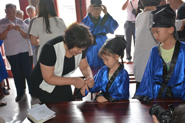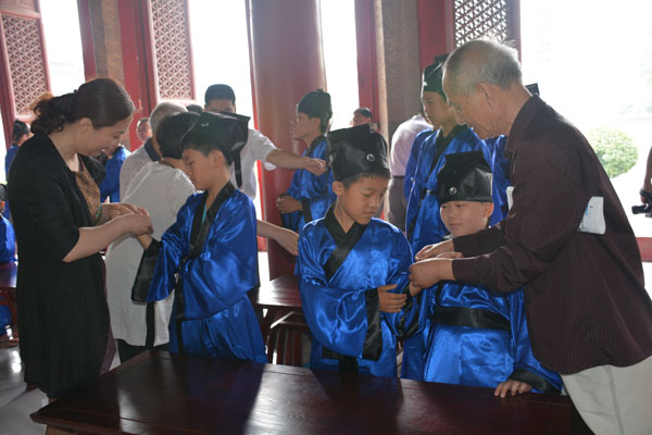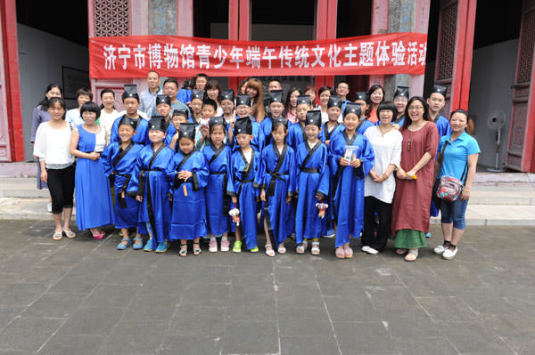 孩子们分为“屈原” “离骚”两组,每答对一题他所在的队伍就会获得一枚香粽,大家争先恐后的举手,有的甚至开始抢答,场面热闹非凡,孩子们所了解的端午知识丰富多彩,甚至还能说出故事的典故,个个都很优秀。第二部分是是汉代礼仪学习,汉代文化博大精深,礼仪文化更是值得我们每一代人学习,子曰:“君子博学于文,约之于礼,亦可以弗畔矣夫!”礼仪对我们中国人十分重要,孩子从小学礼,是对素质的培养、文化的体现。第三部分是茶文化讲堂,中国自古以来就讲茶道,学习茶文化,对孩子修身养性,练习内敛之气很有帮助。孩子们的求知欲望强烈,在展示过茶艺之后提出的问题更是不绝于耳,坚定的眼神中带着蓬勃的希望和对未来的信心。来我馆参观的领导亲自为孩子们戴上了象征幸福希望的彩色丝带,在这个特殊的日子里希望他们明天会更好!