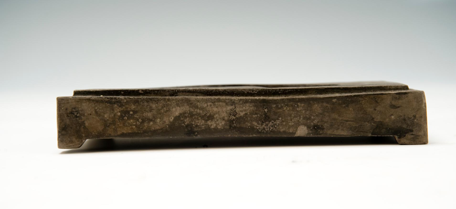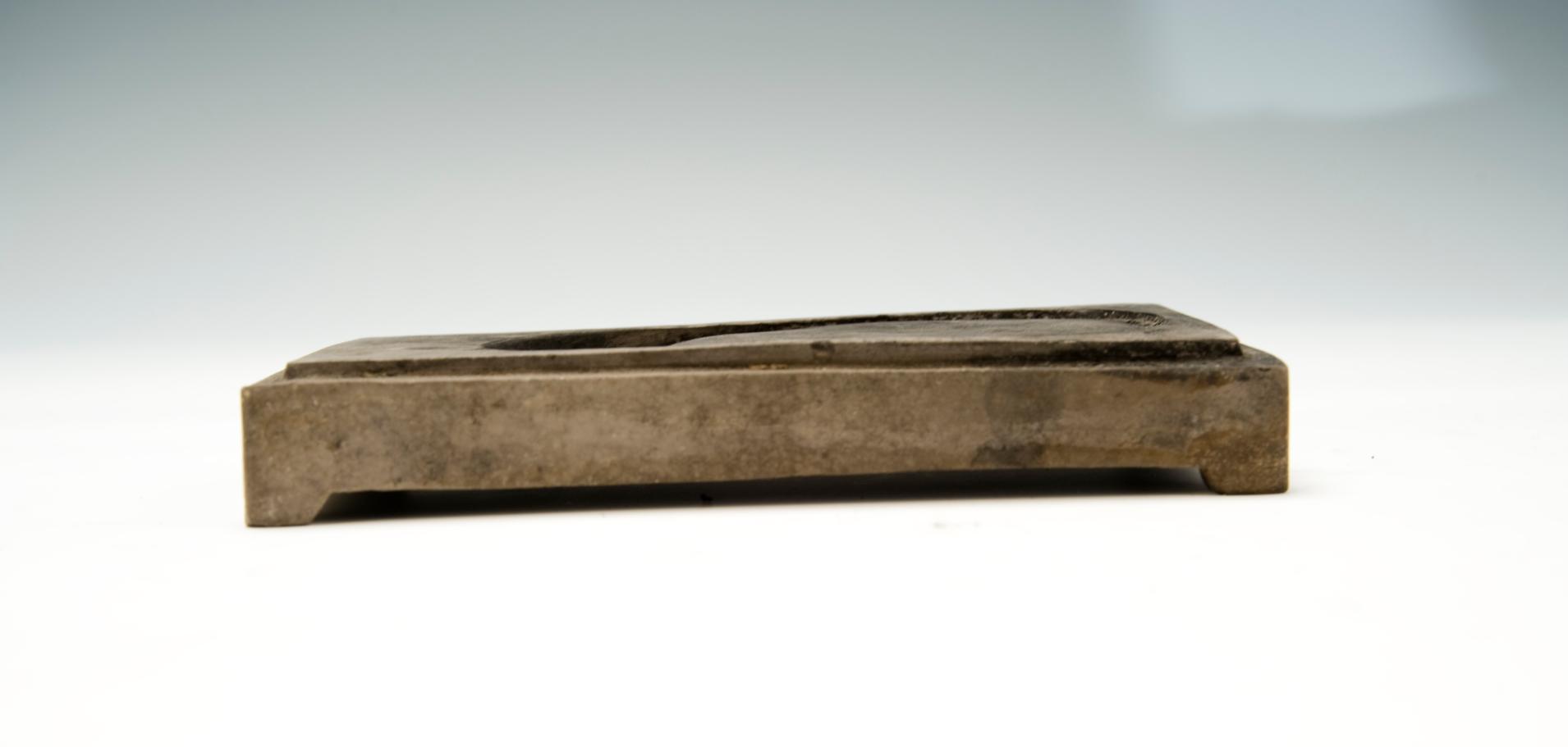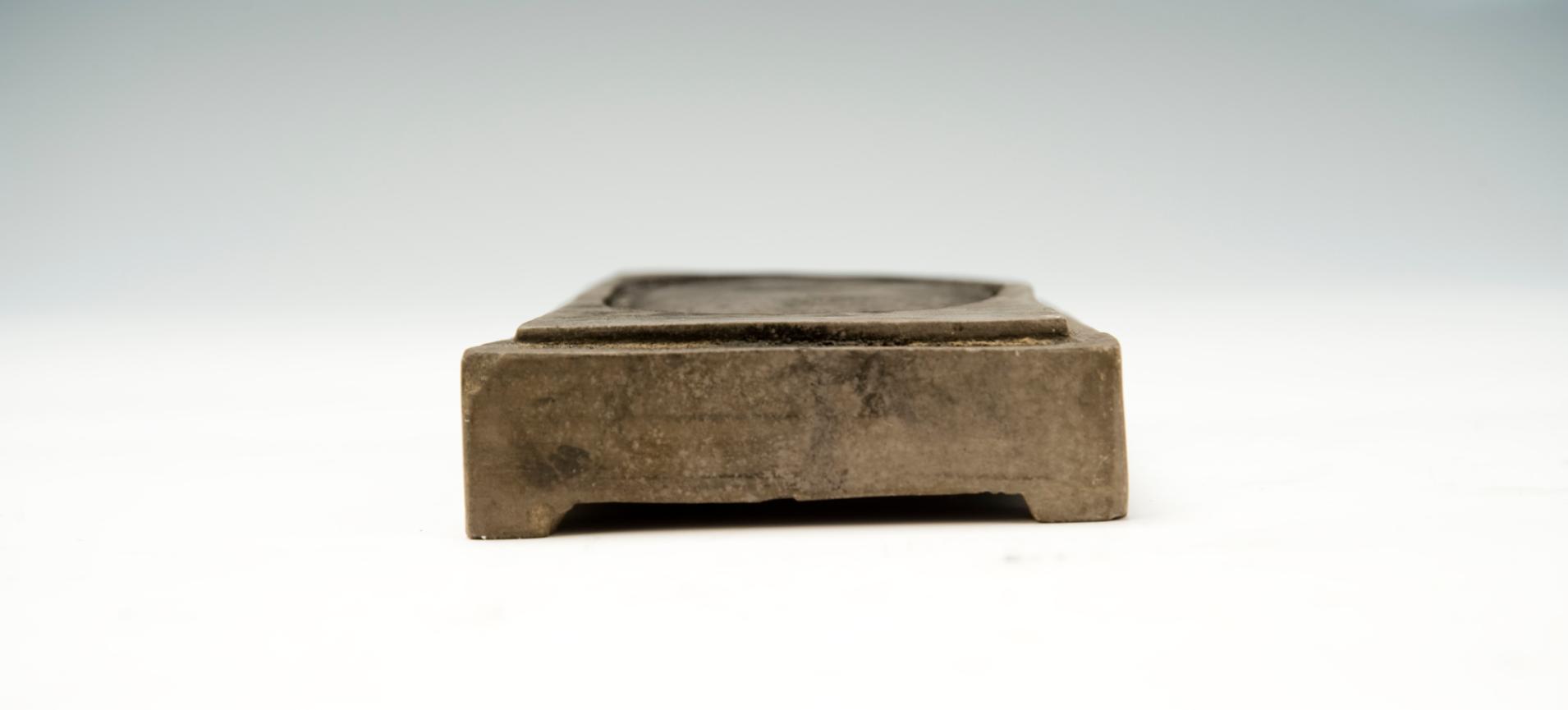 长方形砚面凸起,其上为椭圆形凹槽,砚池平浅,造型简约,背面烧刻有铭文“东鲁柘砚”。