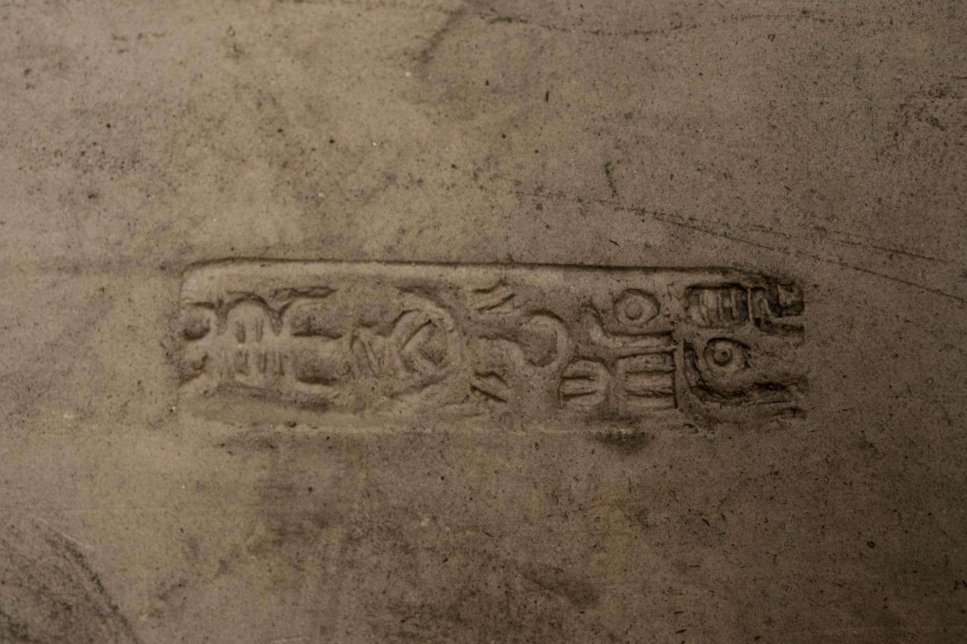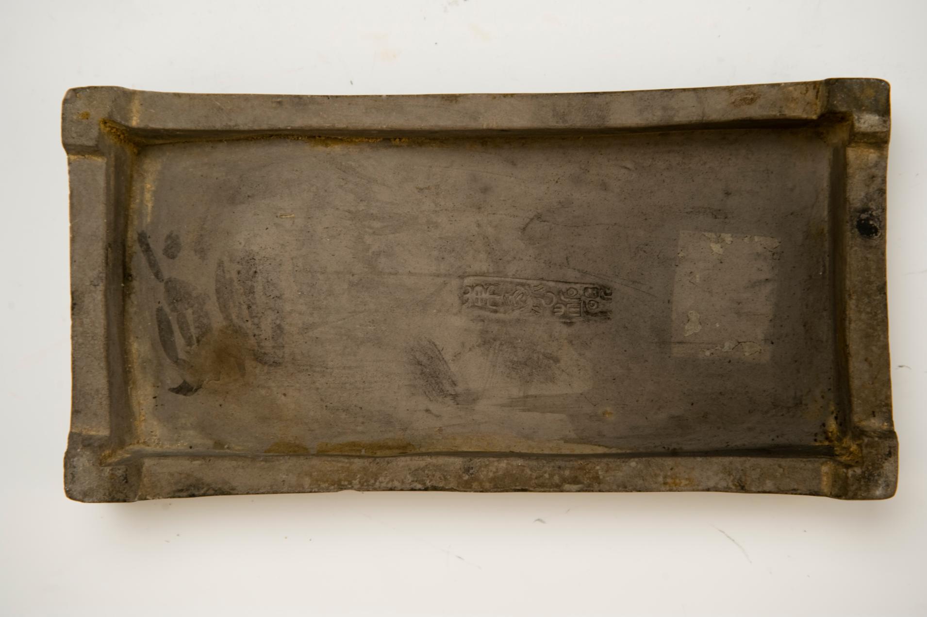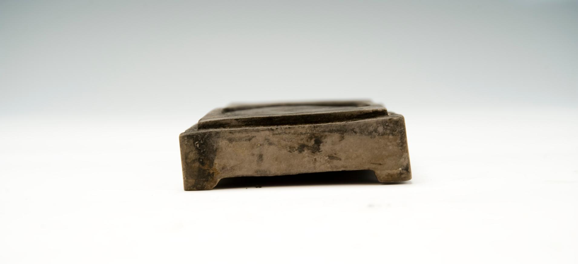 长方形砚面凸起,其上为椭圆形凹槽,砚池平浅,造型简约,背面烧刻有铭文“东鲁柘砚”。
