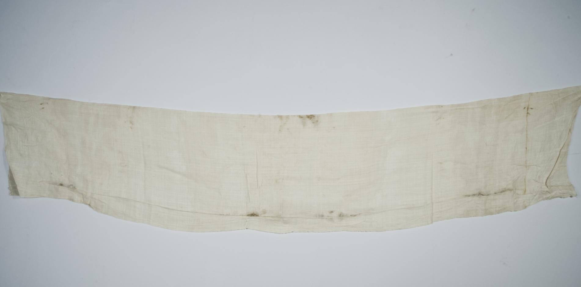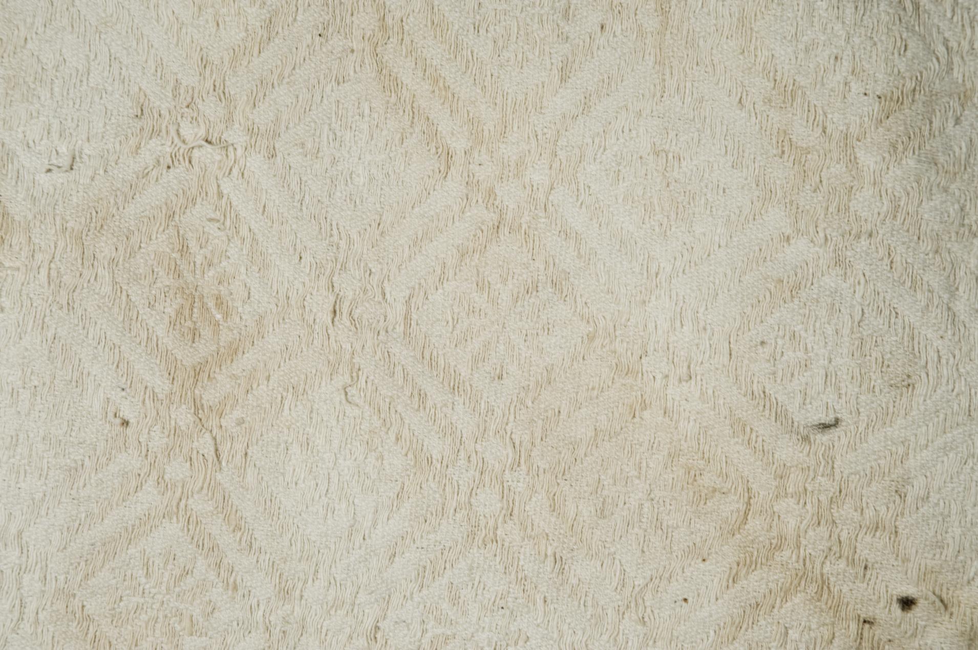 完整单幅,底线色白,提花线呈淡黄色,双经单纬,每平方厘米用经16、纬10棉纱织成,纬线提花。韧性强,具厚软感觉,织锦下为双幅棉布托衬,接线处用线缝合,麻布每平方厘米经16、纬18。