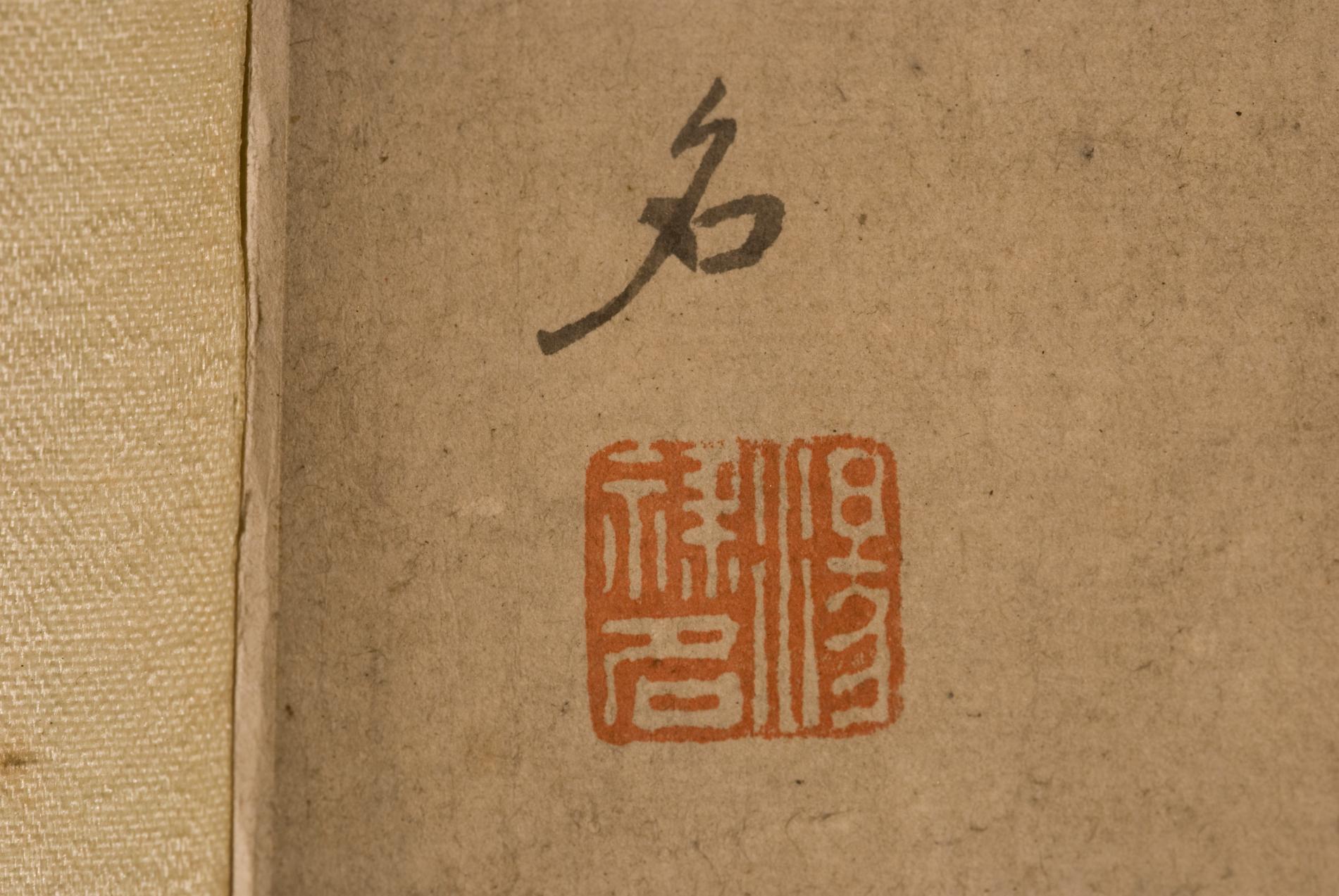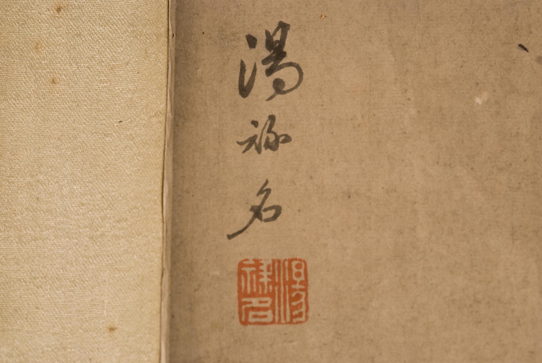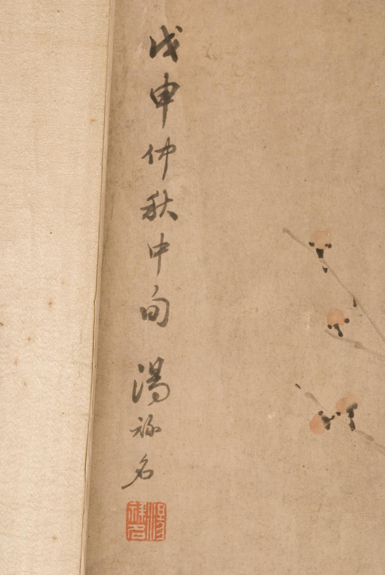 纸本设色。绘两只小鸟栖于梅枝之上,小鸟用墨浓淡相济,格调高雅,左上题“戊申仲秋中旬,汤禄名”,钤白文方形印“汤禄名”。
