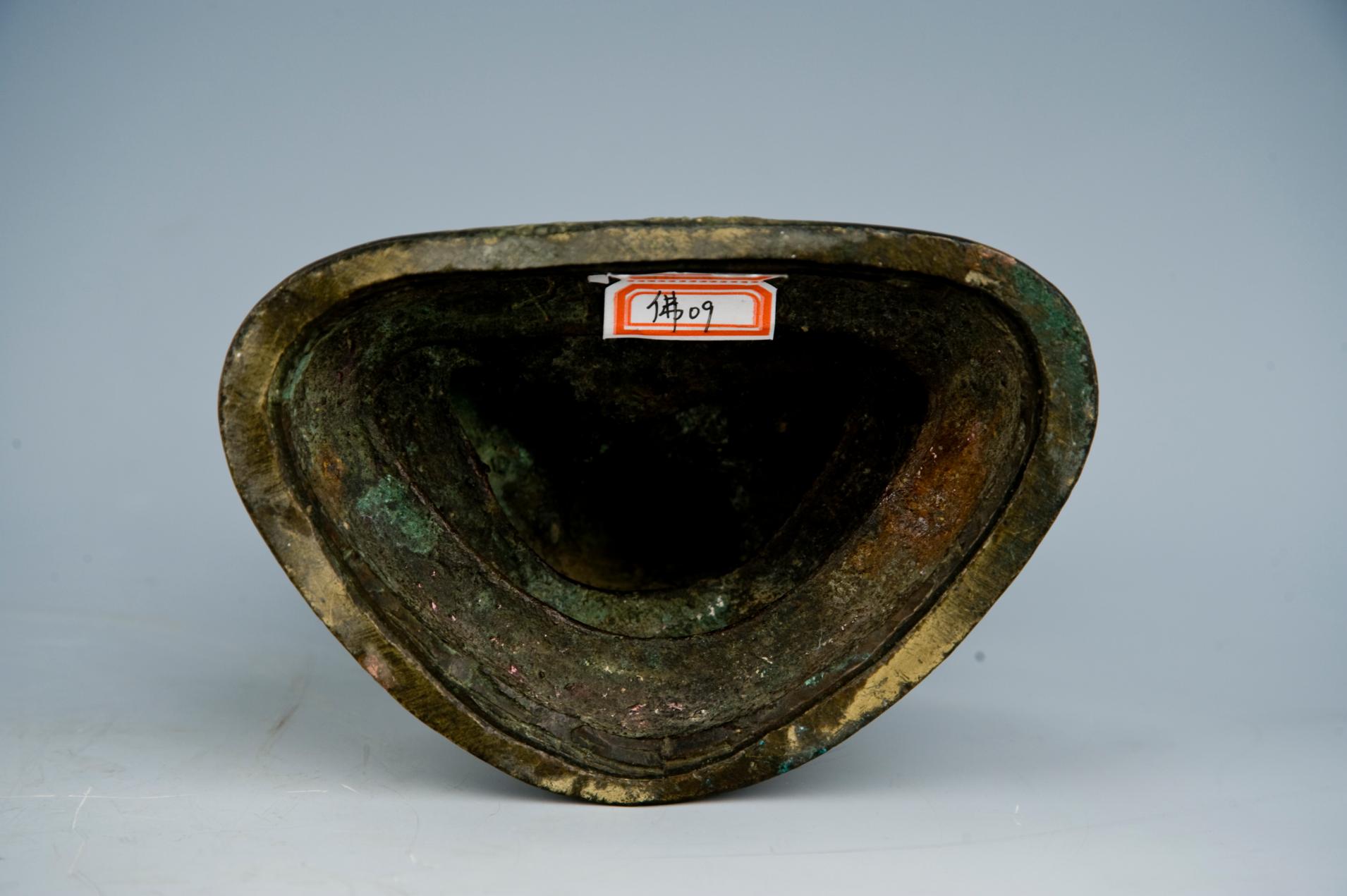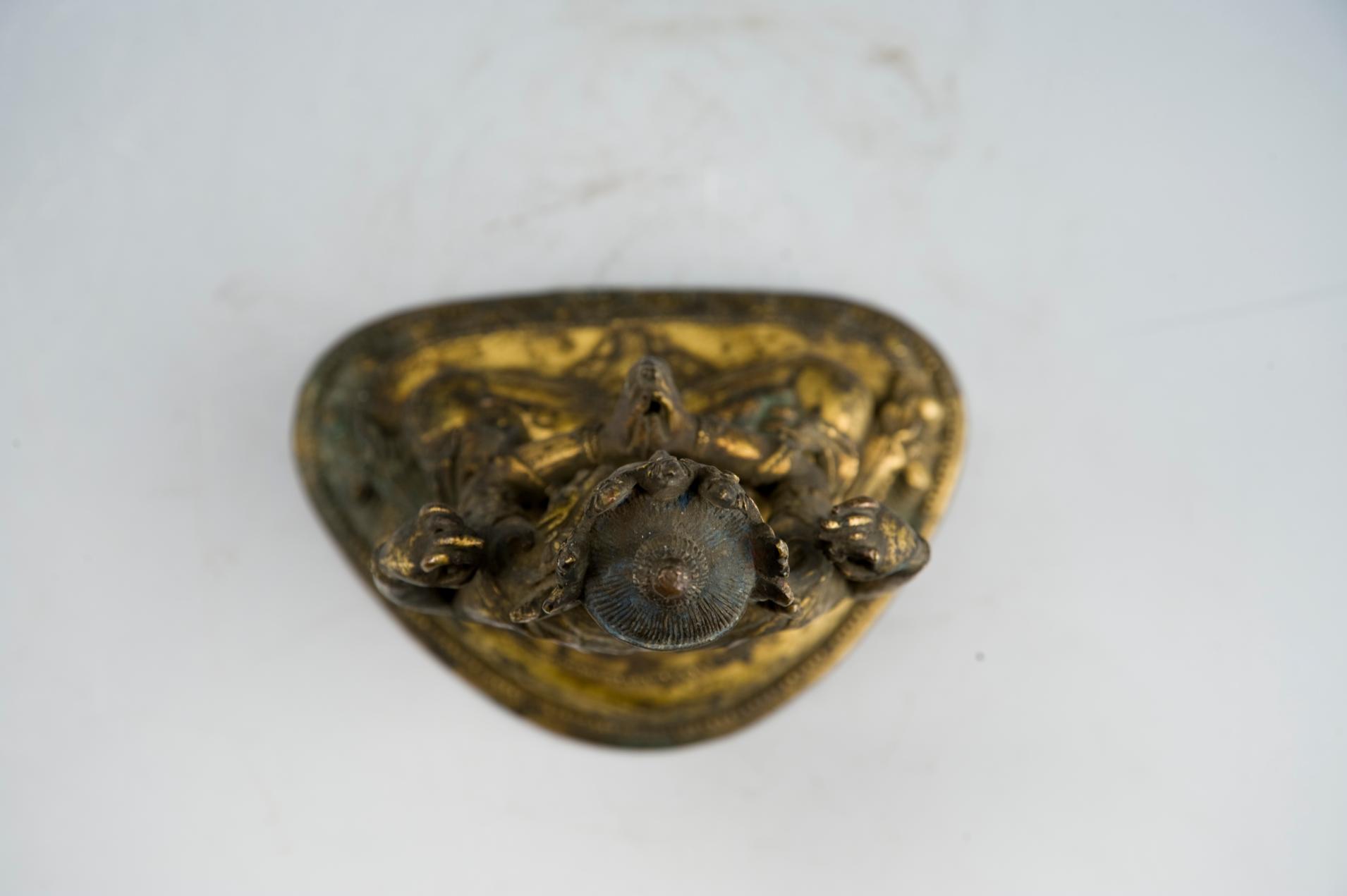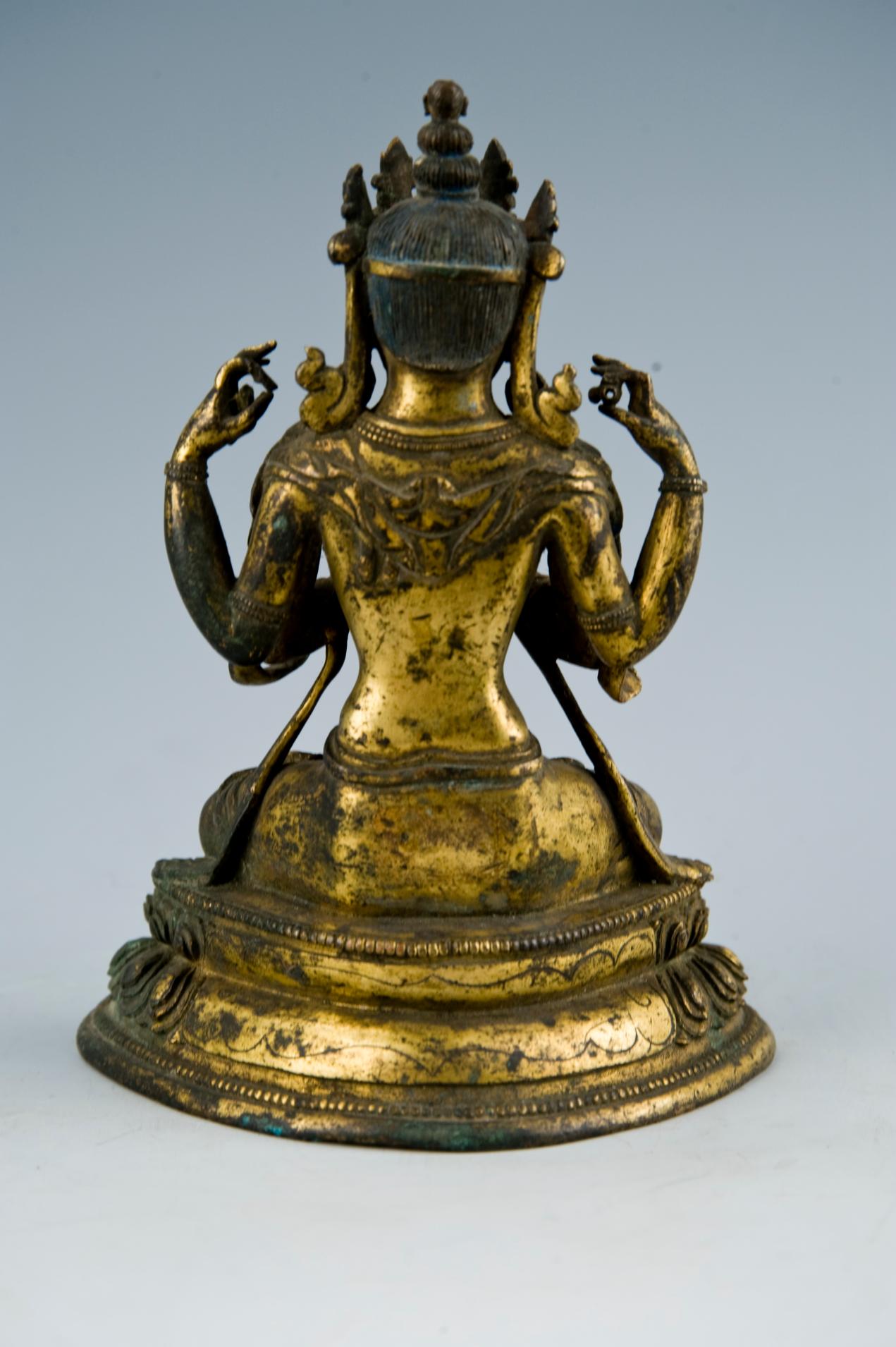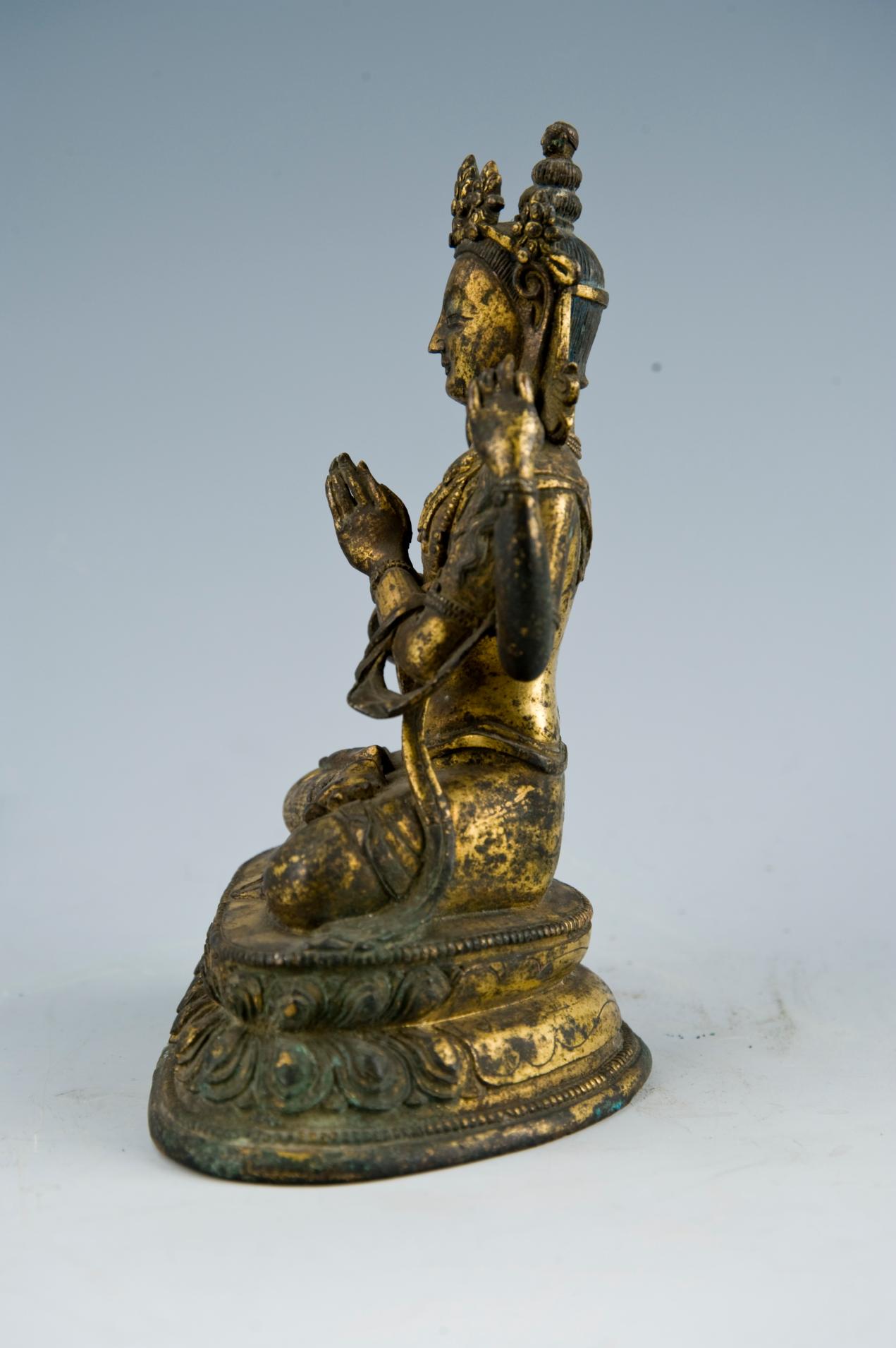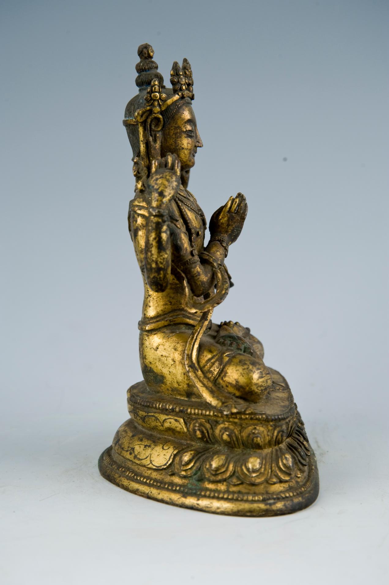 观音整体鎏金,头戴五佛冠,发髻高耸,耳下坠,耳珰垂肩,面容端庄,神态慈祥,跏趺坐于莲花座上,正面双手合十,另两手左手执法器,右手持念珠。身着天衣,佩璎珞、钏饰,耳际云形缯带,披帛绕臂而下,造像工艺精湛,富丽华贵。