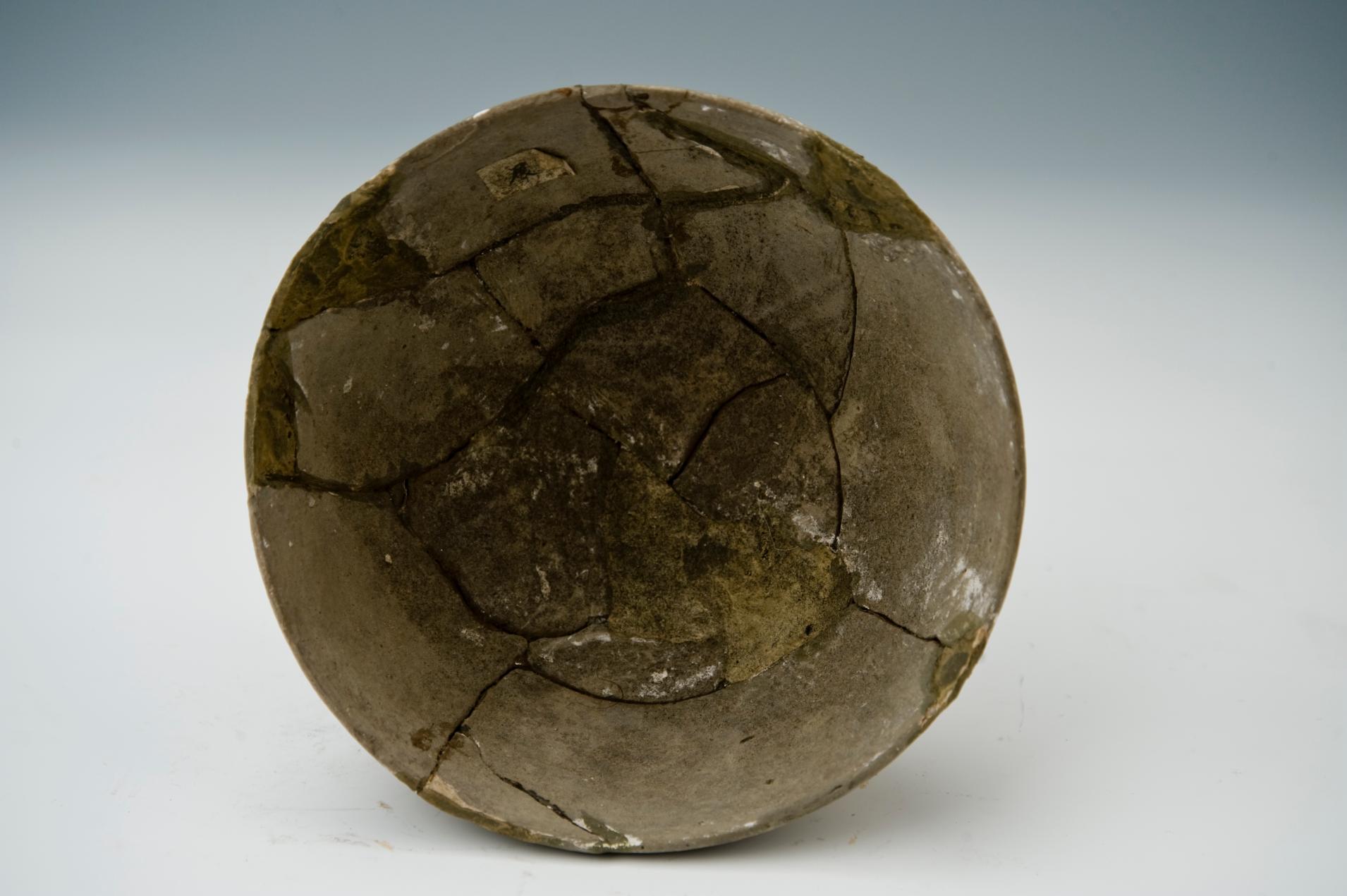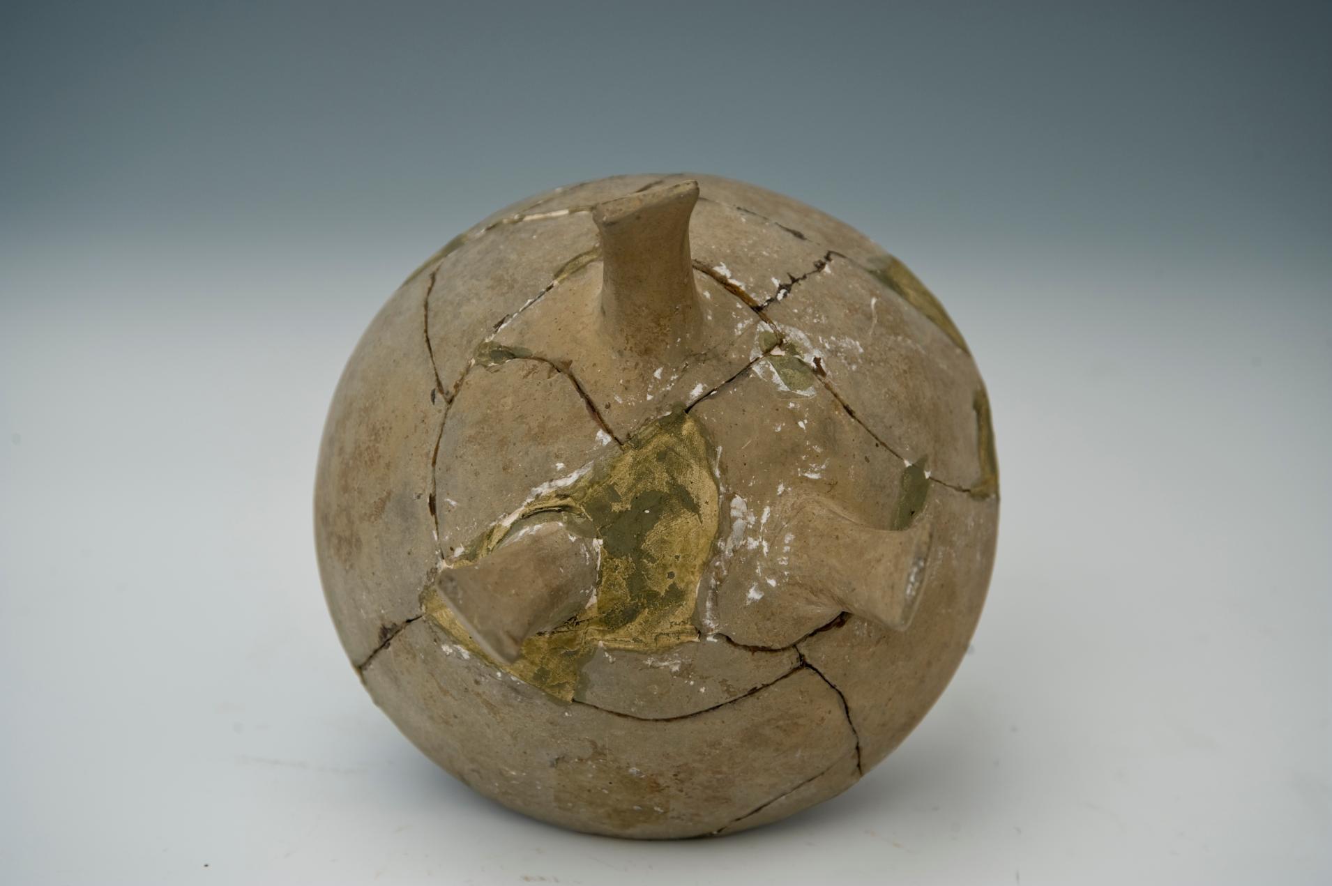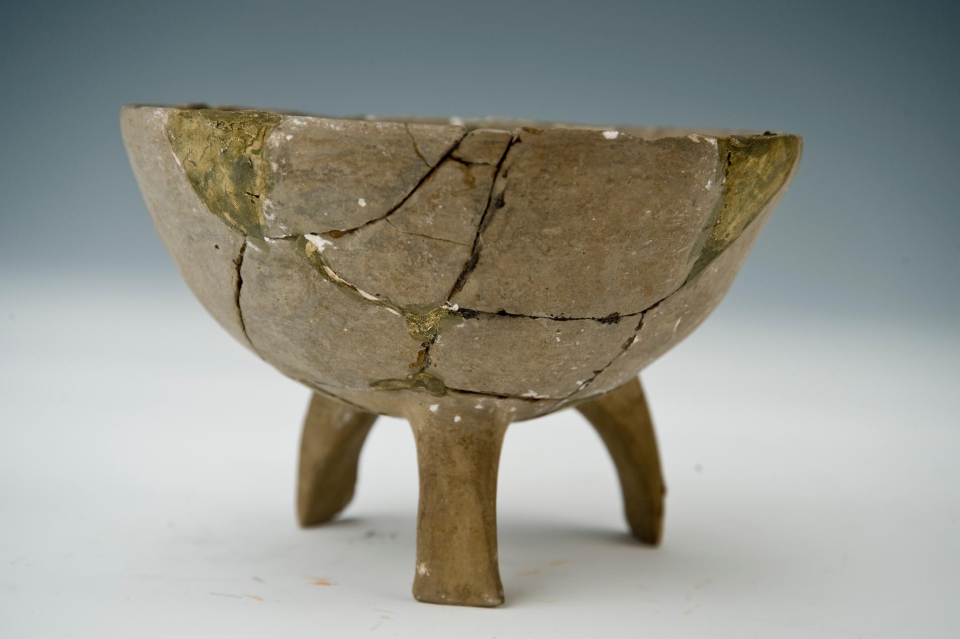 敞口、钵形腹、圜底三扁铲形足,夹沙灰陶。