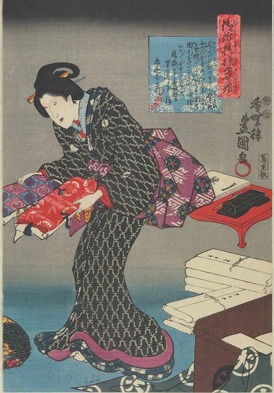 Fashionable brocade patterns of the Imperial Palace, woodblock print, made by Utagawa Kunisada, 1847-1852, Japan。 Museum no。 Circ.636 to Circ。 638– 1962。 ? Victoria and Albert Museum, London。