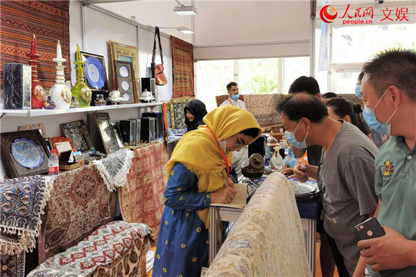距离舞台不远,许多观众聚集在伊朗伊斯兰共和国驻华大使馆展位前,听工作人员介绍当地的特色铜盘和地毯,了解它们的制作工艺和特点。