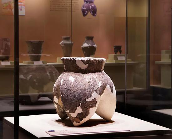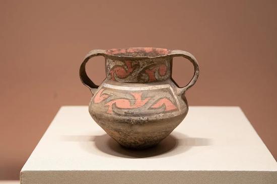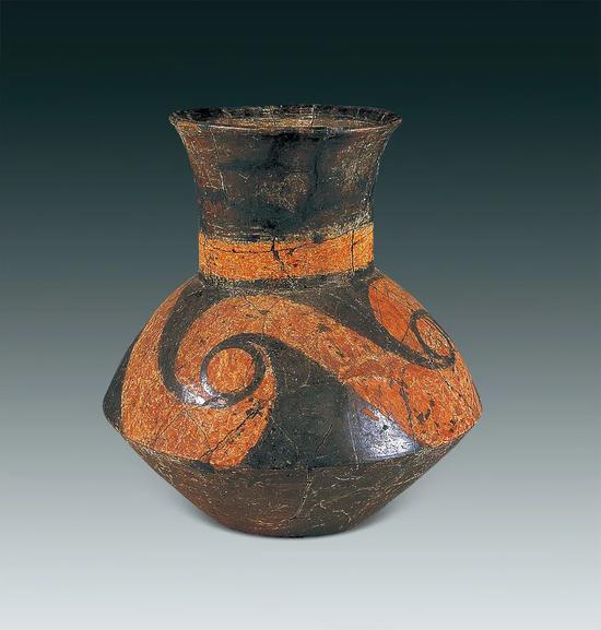 在陶寺遗址中,彩绘陶器发现数量较少,主要出土于大、中型墓葬,同一种器物,依墓主身份不同,所用的件数、规格、结构、尺寸和精美程度也有不同,是墓主身份和等级特权的象征,从此开启了随葬品制度中长达几千年的礼制传统。彩绘纹饰的主题,如圈点纹、条带纹、几何纹、涡纹、云雷纹、龙纹、变体动物纹等,对后来青铜器的纹饰构成具有深远的影响。此次展出的一件彩绘陶壶为泥质褐陶,外施黑色陶衣。颈下部有红色条带一周,肩部以磨光黑陶衣为地,上用红彩绘卷云纹,下腹着绳纹。