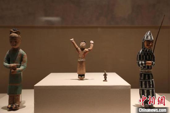 新疆维吾尔自治区博物馆收藏的唐代彩绘泥塑武士立俑(右一)。四川博物院供图