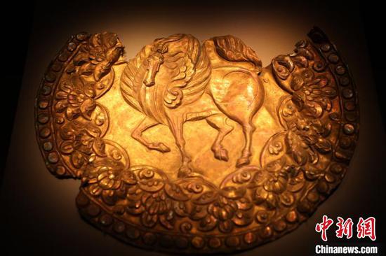 青海湟源古道博物馆收藏的唐代錾刻团窠飞马纹饰片。四川博物院供图