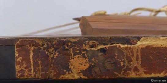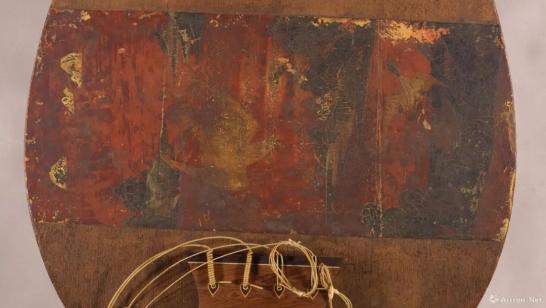 相较2019年展出过的“螺钿紫檀五弦琵琶”,今年展出的这把“紫檀槽琵琶”,实在不怎么惹人注意。大面积的木制原色,一面饰山水图景,朱砂的底色几乎与琵琶融为一体,仅有金箔制的山水略微突出;而另一面仅有两条相交弧线,风格十分质朴。