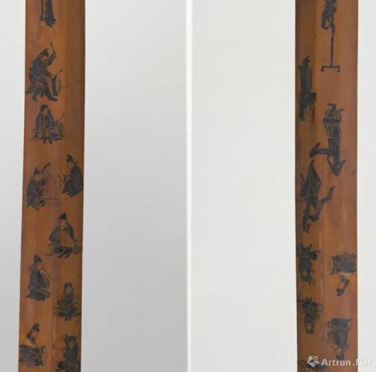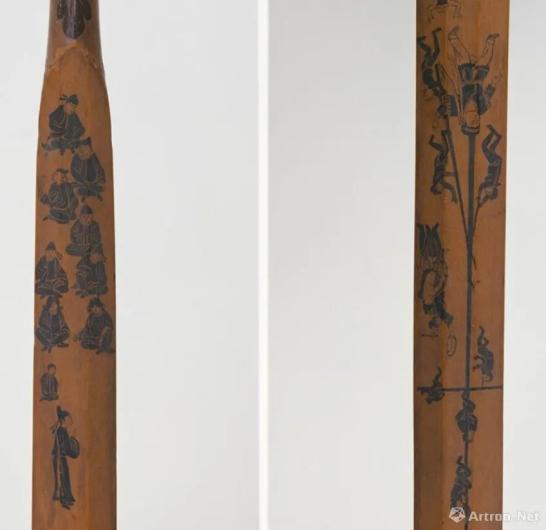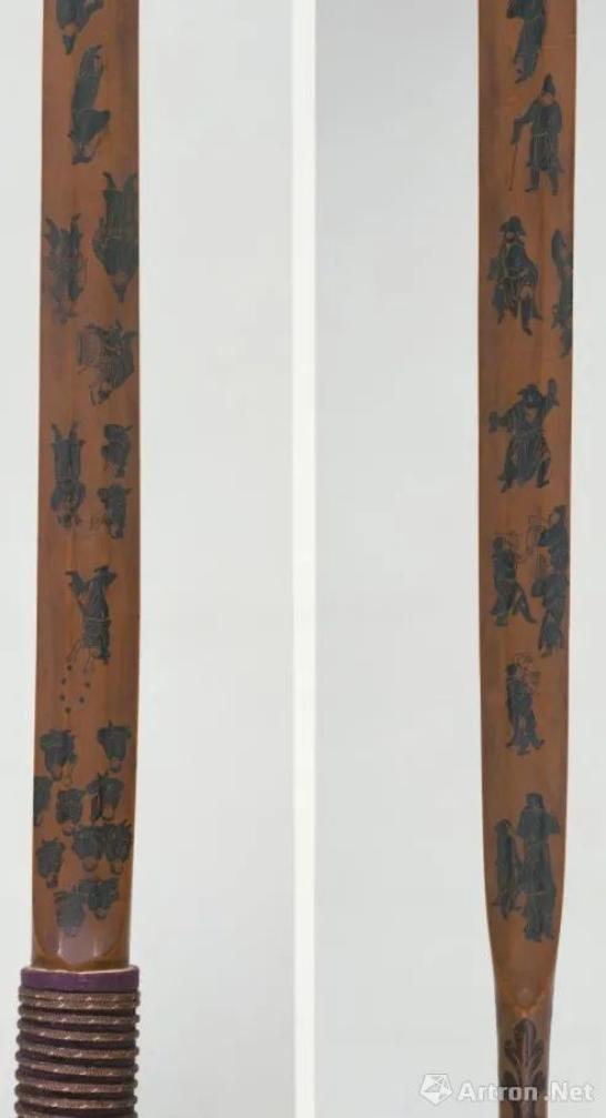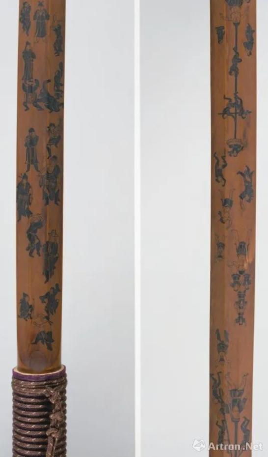 整件弹弓长162厘米,弓竿上画了96个呈现不同姿态的曲艺、杂技等表演者的图案,有正在演奏各种乐器的艺人,包括琵琶、箜篌、尺八、横笛、笙、扁鼓等;也有在乐器伴奏下,热闹的杂耍,如爬杆、走索、顶缸、弄剑等。
