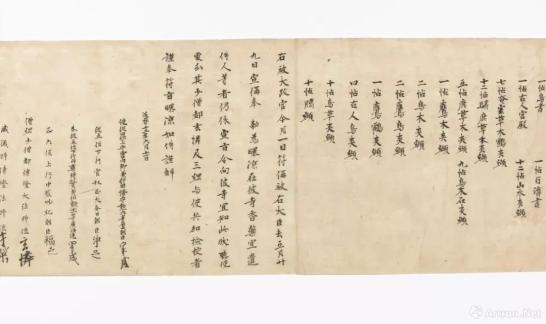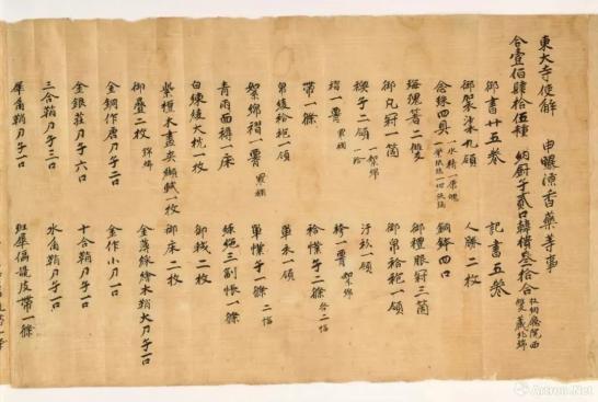 难得的是,正仓院的每次动作基本都有文献记录。正仓院的第一批宝物来自圣武天皇和光明皇后的进献,而每次进献都以文献记之,是为《东大寺献物帐》,于2019年正仓院展出。这为正仓院宝物的储藏奠定了很好的开端。在正仓院落成至明治期间的1000多年间时间里,12次清点曝晾(据说),均有记录。在延历十二年六月十一日的宝物的清点曝晾记录——《延历十二年六月十一日曝凉使解》,即在此次展览展出。