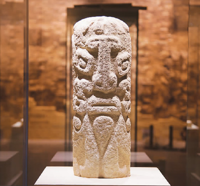 走进展厅,记者的目光便被一件高60.3厘米的双面人面石柱所吸引。石柱前后两面都雕刻着人面形象,凸目,高鼻,厚唇,表情威严神秘。这是石峁皇城台出土石雕中的精品,采用了浮雕、圆雕、阴刻等多种技法,其造型体现出多元文化的复合,并对商周青铜器的造型装饰艺术产生了深远影响。