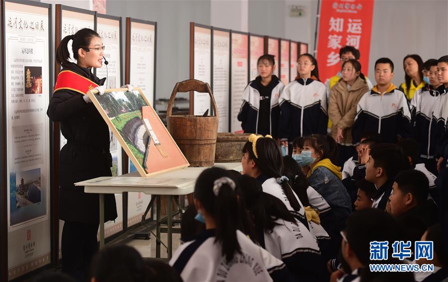 10月21日,在河北沧州青县大杜庄中学,讲解员为学生讲解运河沧州段谢家坝的构造。 新华社记者 王民摄