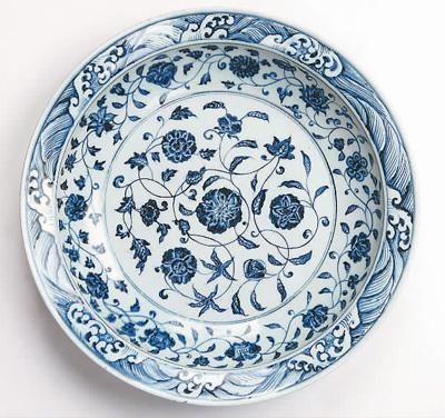 明代郑和奉命七下西洋,足迹遍布亚洲、非洲30多个国家和地区。郑和每次下西洋,都会携带大量瓷器作为礼物与贸易商品,其中精美实用的青花瓷在海外尤其是伊斯兰地区大受欢迎。展厅里陈列了一组明宣德时期的青花瓷,是用郑和从阿拉伯国家带回的“苏麻离青”钴铁矿烧制而成,呈现出蓝宝石般的鲜艳色泽。这些瓷器的器型也受到海外影响,如折沿、平底的青花缠枝花卉纹洗和青花缠枝莲纹花浇,就是源自西亚的金属器和玻璃器。