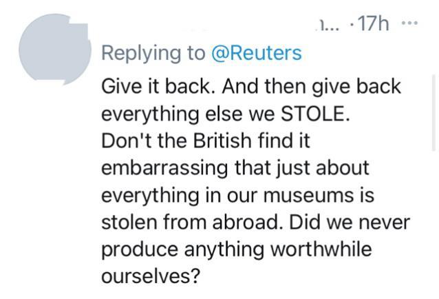 “还回去,然后把所有我们偷来的东西还回去。我们的博物馆里所有东西都是从国外偷来的,难道英国人不觉得这很丢人吗?我们自己做出过任何有价值的东西吗?”