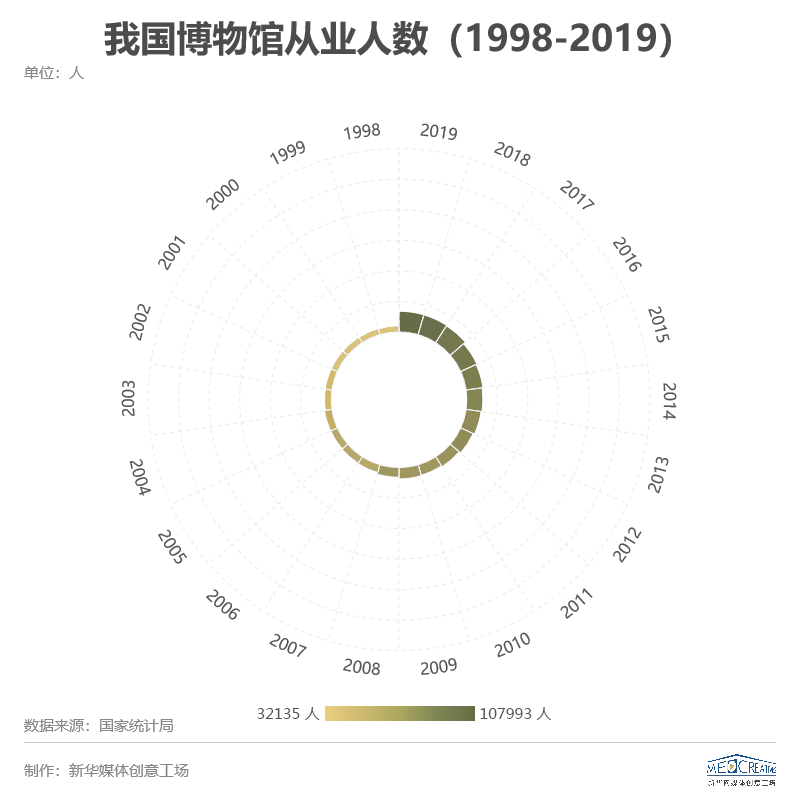 1998年到2019年,我国博物馆从业人数由32135人增加到了107993人,《我在故宫修文物》播出后的2017年,仅一年内就增长了1.2万人,增长率是往年的两倍还多。越来越多的年轻人走进故宫的大门,亲眼见证一件件被修复的古物和紫禁城的红墙黄瓦;大学生们自愿来到当地的博物馆担当志愿者,为游客讲解文物的历史和背后的故事。