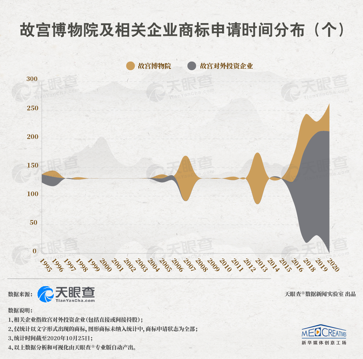 推出文化创意产品是博物馆文化传播的新形式之一,它可以拉近博物馆和参观者之间的距离,使社会大众能在生动有趣的创意产品中体味文化的魅力。其中最具有代表性的,是由前故宫博物院院长单霁翔打造的“故宫文创”。据天眼查专业版数据显示,故宫博物院共申请了384个文字商标,其对外投资企业共申请了660个文字商标。凭借故宫本身的知名度和深厚的历史文化底蕴,结合当下流行元素,故宫文创推出了诸如“朝珠耳机”、《故宫日历》、国宝色口红等系列产品,每年的产品收益都在10亿元以上。