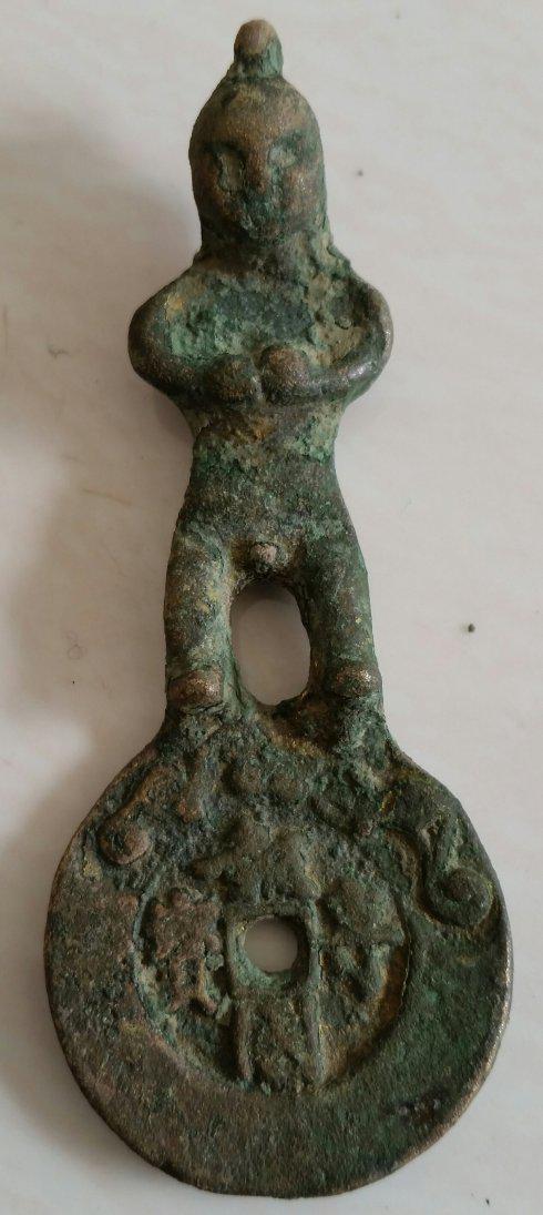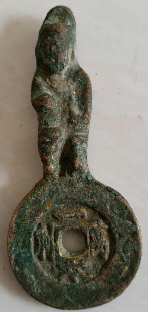下第一品,《报国寺宝背发财多蚨》钱,此钱老锈莽苍,拨开坚硬的锈伽可见黄亮鎏金斑点;钱体型制奇特,上部人物,下部圆孔圆钱,方孔圆钱上面站立一男孩,男孩的动感,妙不可言;下部方孔圆钱正面中心“报国寺宝”四个汉字,俊秀、飘逸,上缘男童脚下踩着两只携带金钱的蝙幅从天而降,下缘锈斑里面隐约可见祥云图纹,从而使得吉祥物生动、得体、富有立体感;背面为“发财多蚨”四字,宽缘上有展翅飞翔的青蚨及寺庙的法轮纹饰。由于国内名为报国寺的庙宇佛堂实在太多,如北京大报国寺、峨眉山报国寺、所以难以判定此钱究竟出自哪座报国寺。至于年代,从男童发髻脸型看为隋唐时期。