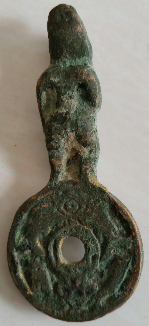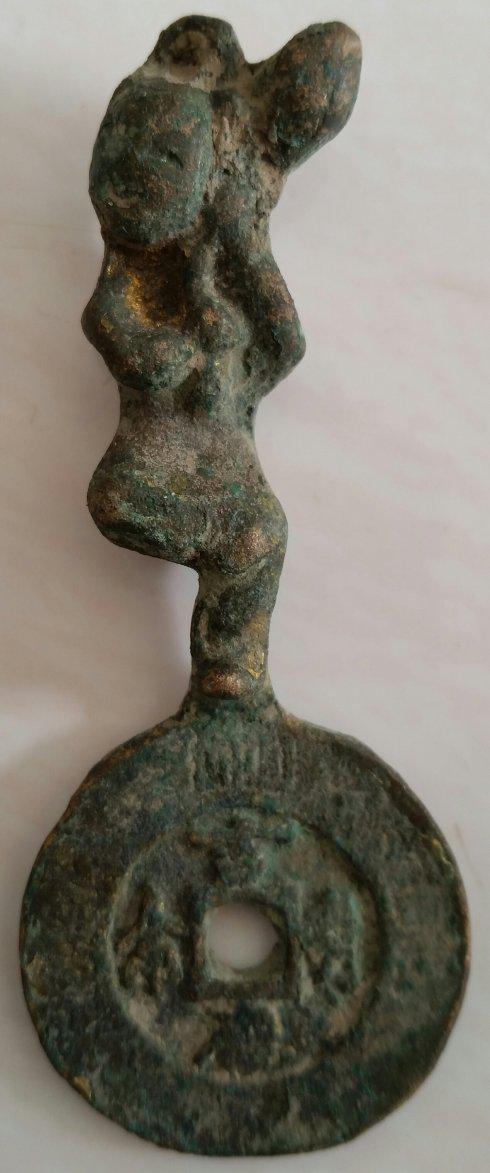 东汉至隋这一时期,也是中国历史上宗教发展的兴盛时期。由此在东汉以后衍生出一类非流通钱币,后世称为民俗钱,这类钱上通常铸有吉语,或表示心愿的文字。宗教思想的兴起,在钱币上也有反映,这就是出现了“厌胜钱”。所谓“厌胜”,就是驱魔辟邪的意思。厌胜钱就是专用来驱魔辟邪的佩钱或冥钱,厌胜钱上有的铸有图案,开了后世花钱之先河。这其中就可见到青蚨的身影。如下图笔者这枚铜钱。