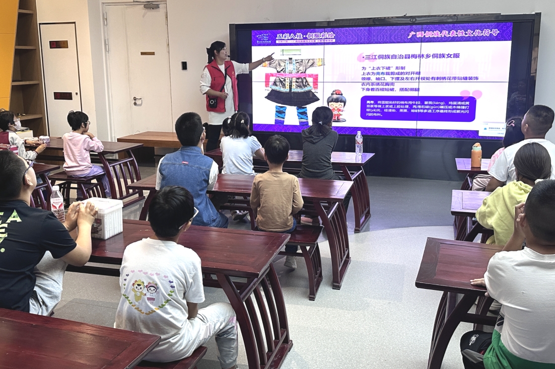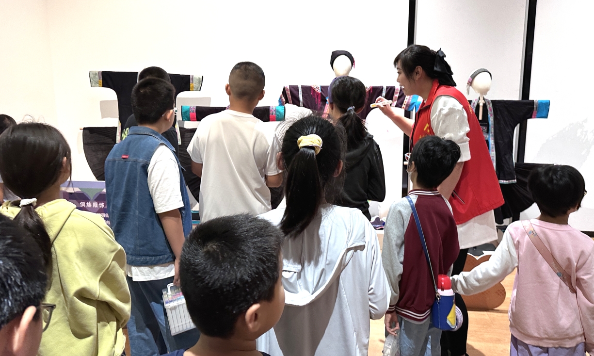 同学们在宣教老师的带领下认真学习了侗族服饰的品类和制作方法。了解到侗族是一个爱美的民族,在侗族人民心中,天地间万物皆有灵,能驱邪避害,他们将太阳、月亮、龙凤、花鸟、山川、河流等生活常见的图案绣在一件件服饰上,图案极具观赏性和装饰性。