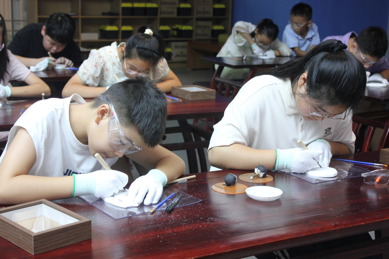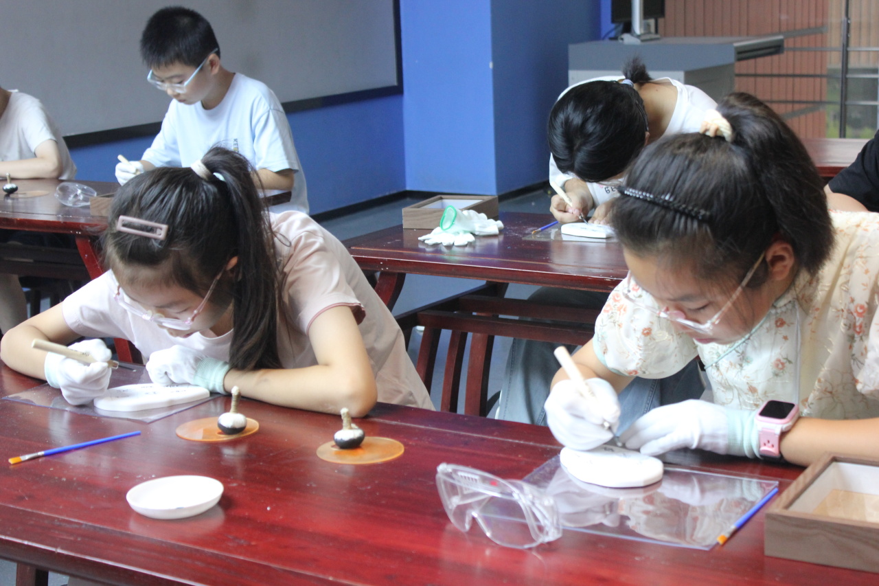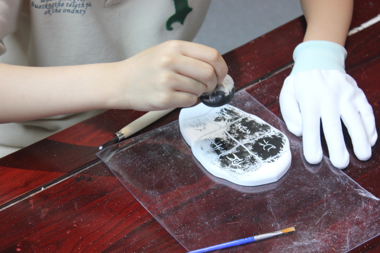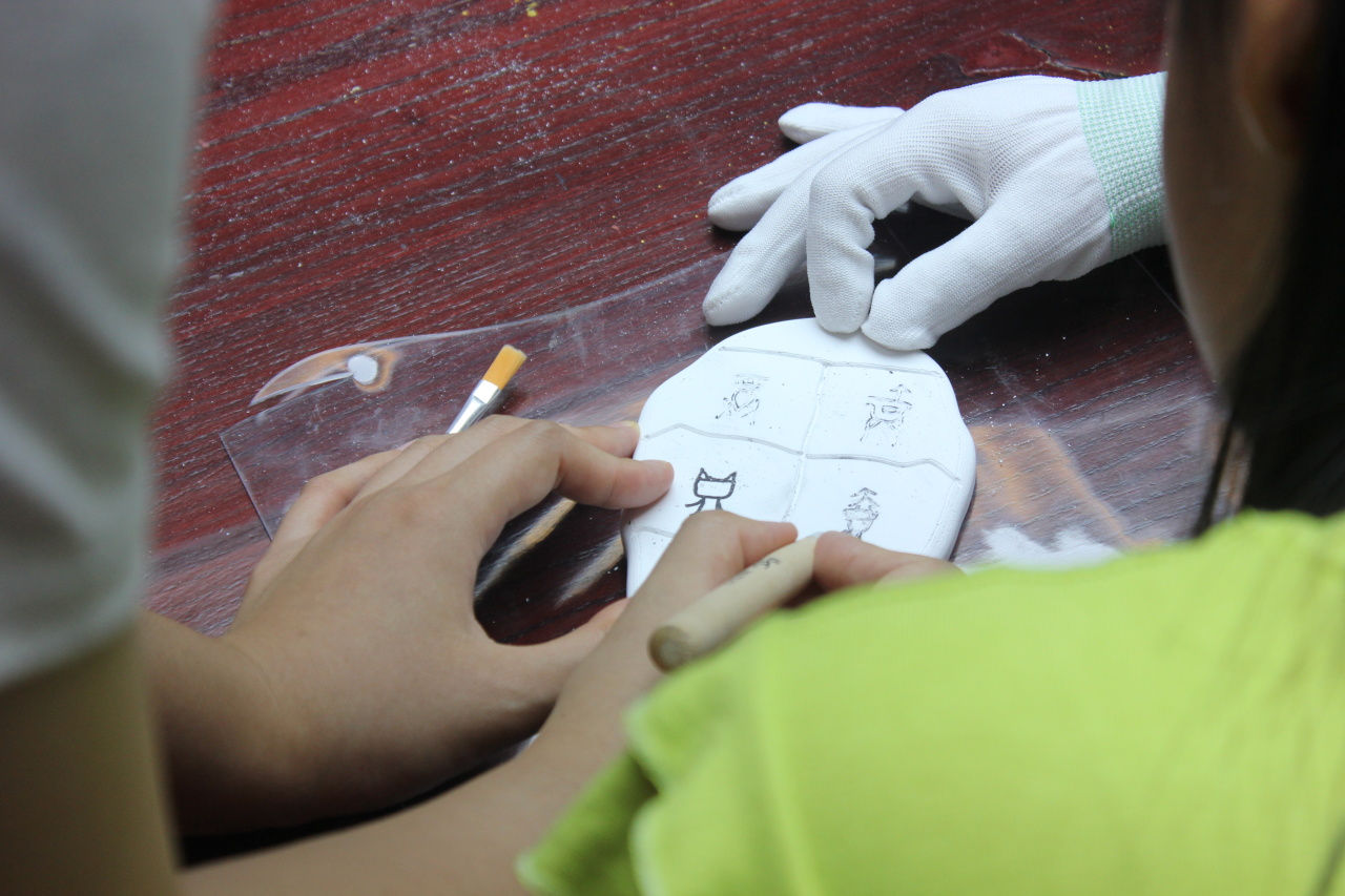在实践环节,社教老师结合馆藏青铜器的典型造型,阐释了“鼎”“戈”“鬲”等字形与器物造型之间的内在联系。孩子们在观察、比较中直观感受到古人造字的思维方式,并在专业指导下于模具上亲手刻画相应甲骨文字形。