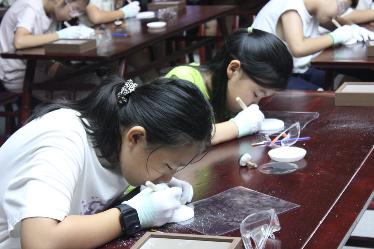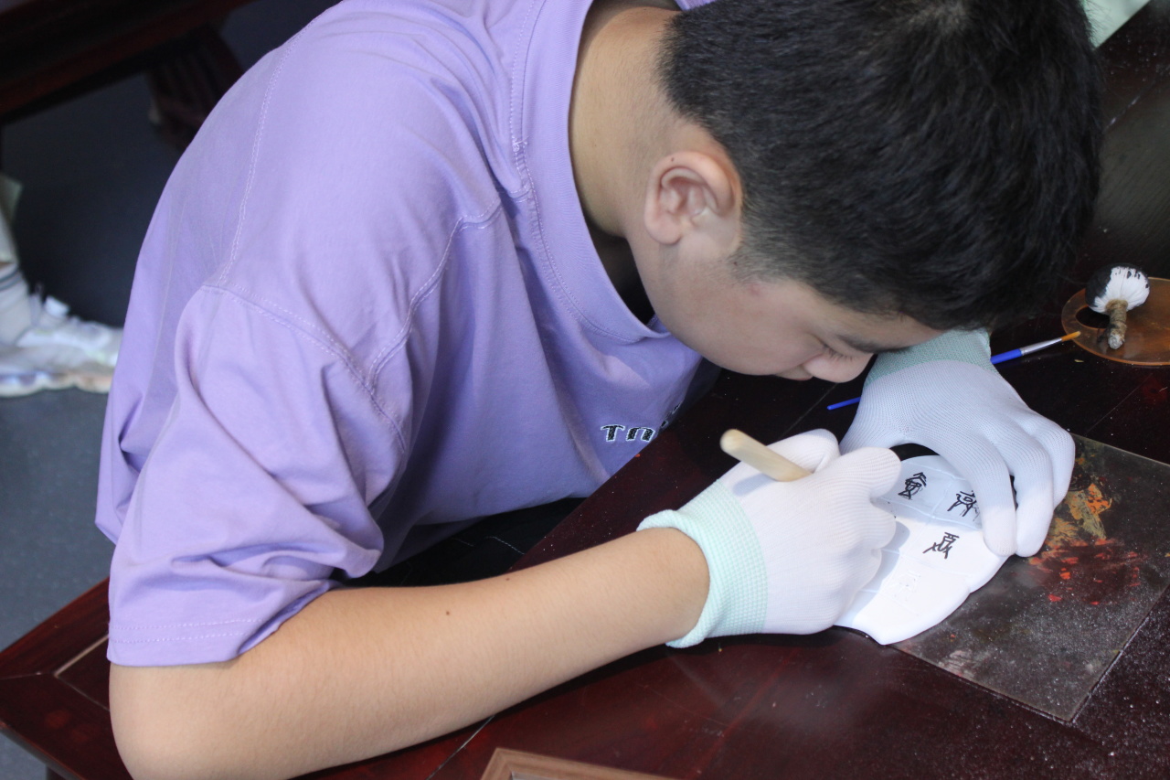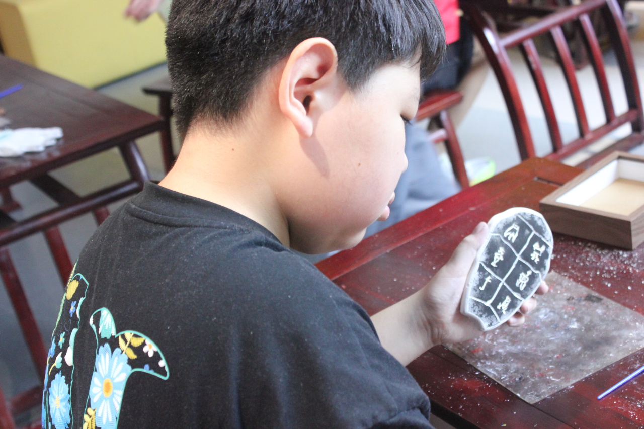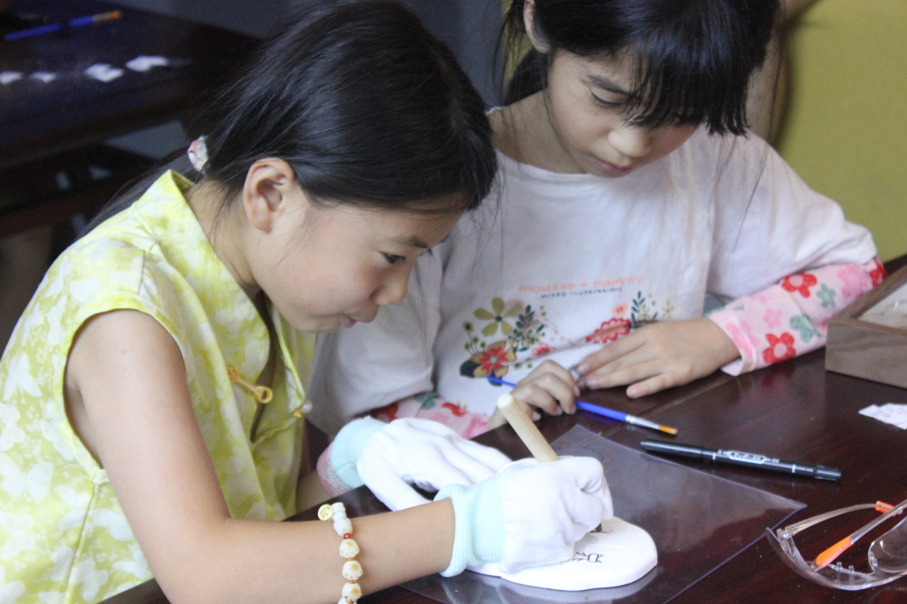 在实践环节,社教老师结合馆藏青铜器的典型造型,阐释了“鼎”“戈”“鬲”等字形与器物造型之间的内在联系。孩子们在观察、比较中直观感受到古人造字的思维方式,并在专业指导下于模具上亲手刻画相应甲骨文字形。