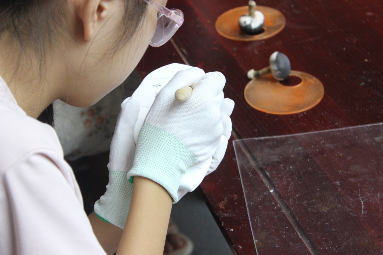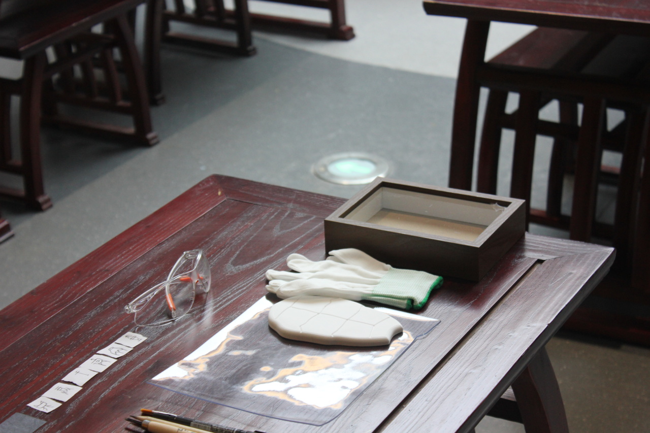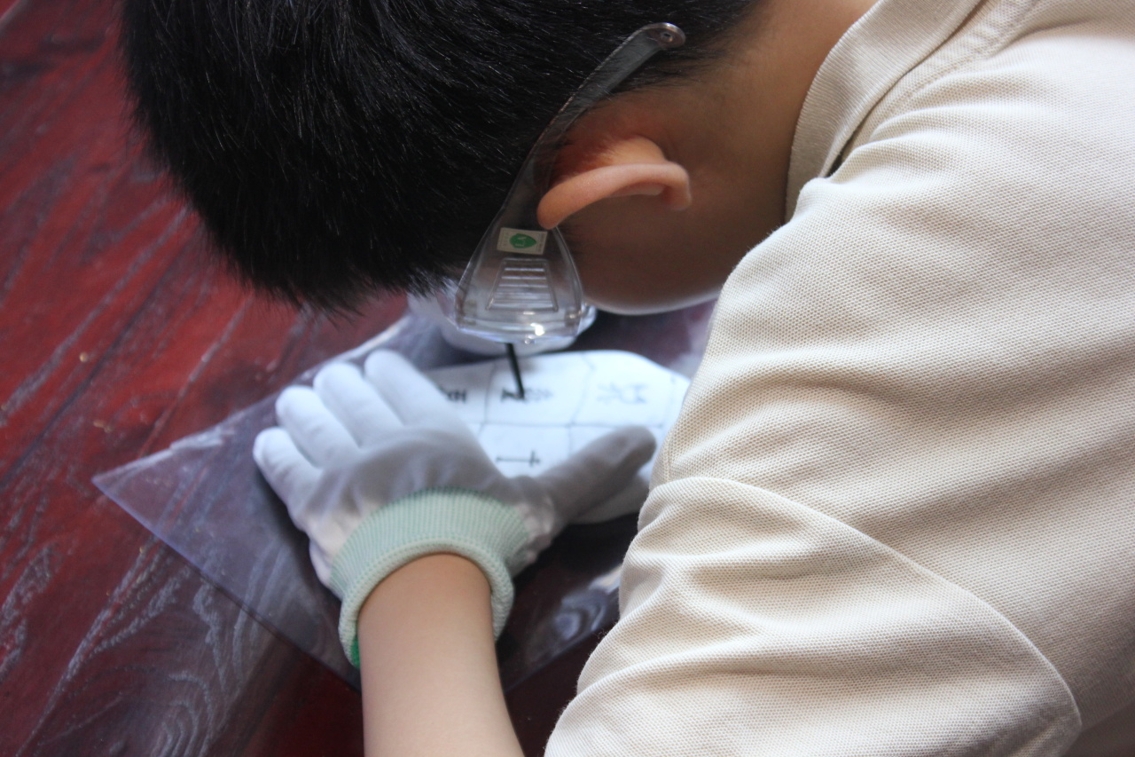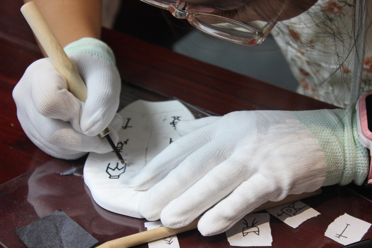 在实践环节,社教老师结合馆藏青铜器的典型造型,阐释了“鼎”“戈”“鬲”等字形与器物造型之间的内在联系。孩子们在观察、比较中直观感受到古人造字的思维方式,并在专业指导下于模具上亲手刻画相应甲骨文字形。