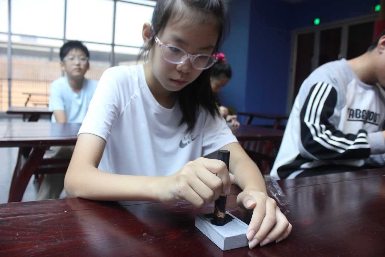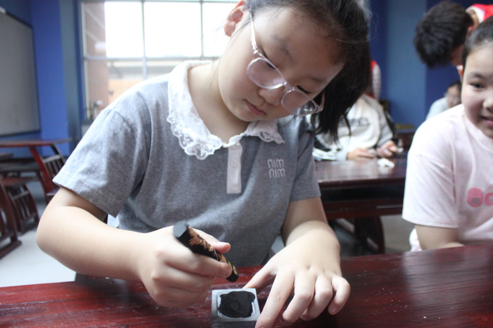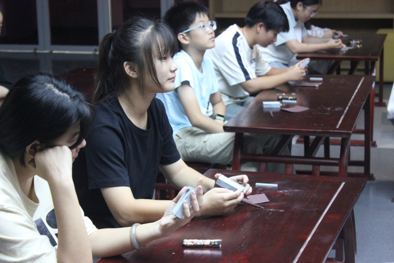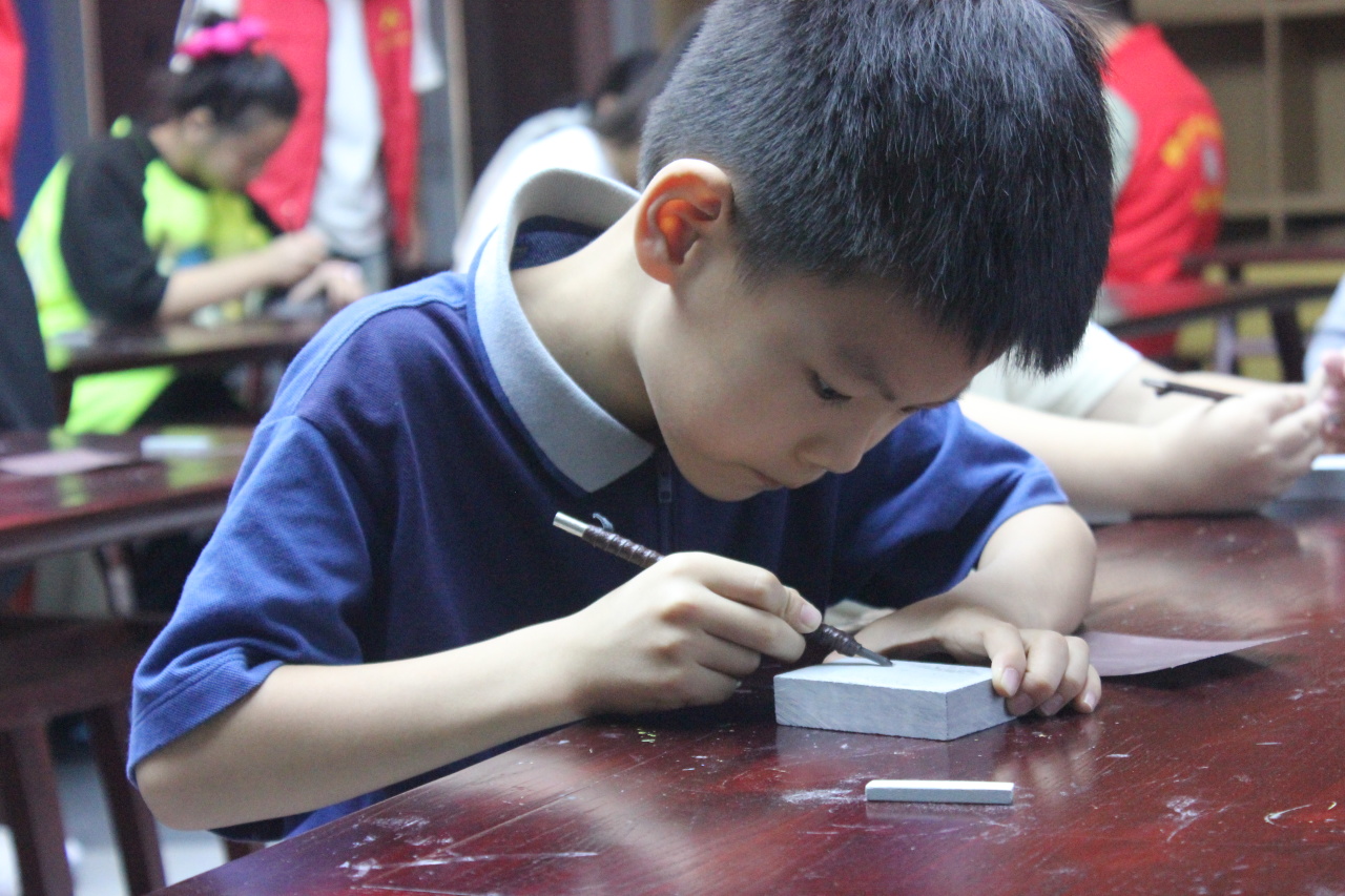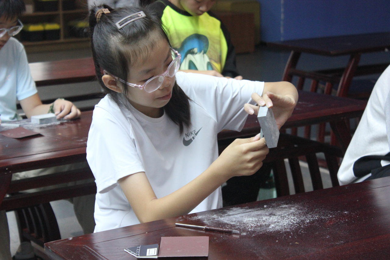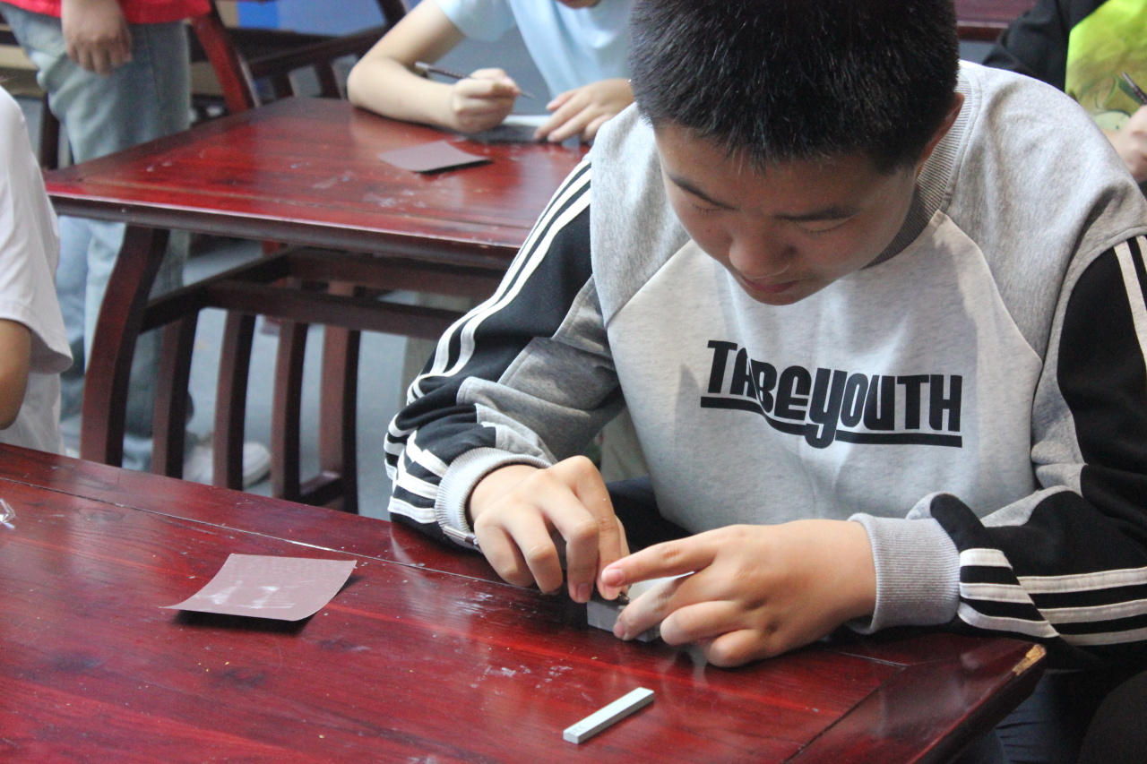 在动手制作环节,同学们亲触砚石的坚润质地,体验打磨与雕饰的过程。通过亲手操作,大家体会到制作一方砚台所需的耐心与专注。每一次研磨、每一道雕刻,都是与历史的对话,也是一次心灵的沉浸与文化的体悟。
