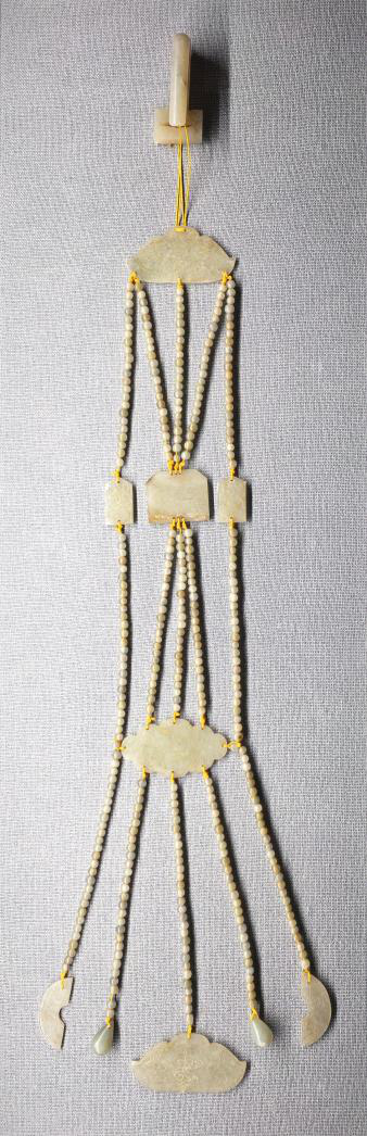 朱檀墓中出土这副正面刻云龙纹描金玉佩,用青玉制成,质地细腻,玉片上刻有描金的云纹。按照中国古代的礼仪,行走过程中,玉片相撞所发出的声响应当缓急有度,轻重得当,如果节奏杂乱则被视为失礼。