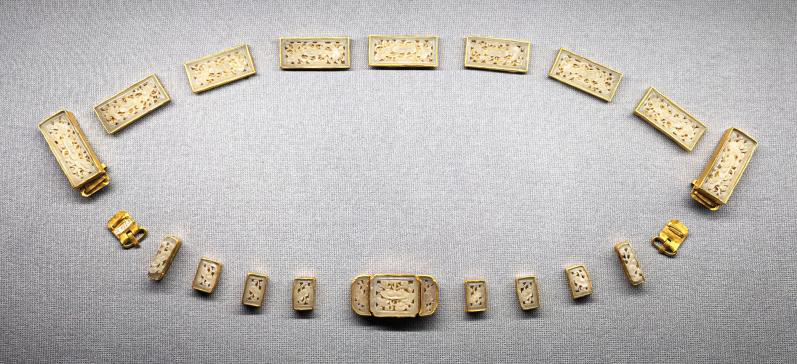 金镶灵芝纹白玉带是一件纯粹的朝服装饰用具,不起束腰的作用,明代是使用玉带极为鼎盛的时期。朱檀墓出土白玉带2条,一素一花,这就是其中的花带。玉带由20块白玉板组成,玉板多作长方形,铊尾最长,所有玉片均透雕灵芝花纹,且用金片包镶,金片亦镂雕花纹。