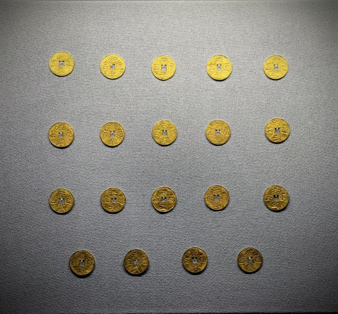 19枚洪武通宝金币的说法很有讲究。一是数字暗藏玄机,19枚似乎隐喻了鲁王朱檀19岁的短暂一生,是对其生平的特殊标注;二是属于明代常见的随葬金银冥钱,出土时压在朱檀身下,是“垫背钱”的丧葬习俗体现,寓意为亡者在另一个世界准备“盘缠”,也寄托了生者的祈福之意;三是金币为纯金制成,正面手工錾刻楷书“洪武通宝”,虽非流通货币,却尽显明初亲王的丧葬规格与工艺水平。
