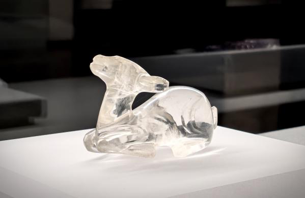 还有一件水晶鹿镇纸,用整块水晶琢成,质地纯净莹澈,鹿昂头伸颈,四肢蜷曲,弓背伏卧,半睁细长的双眼,双耳紧贴在脑后,刻画得惟妙惟肖。