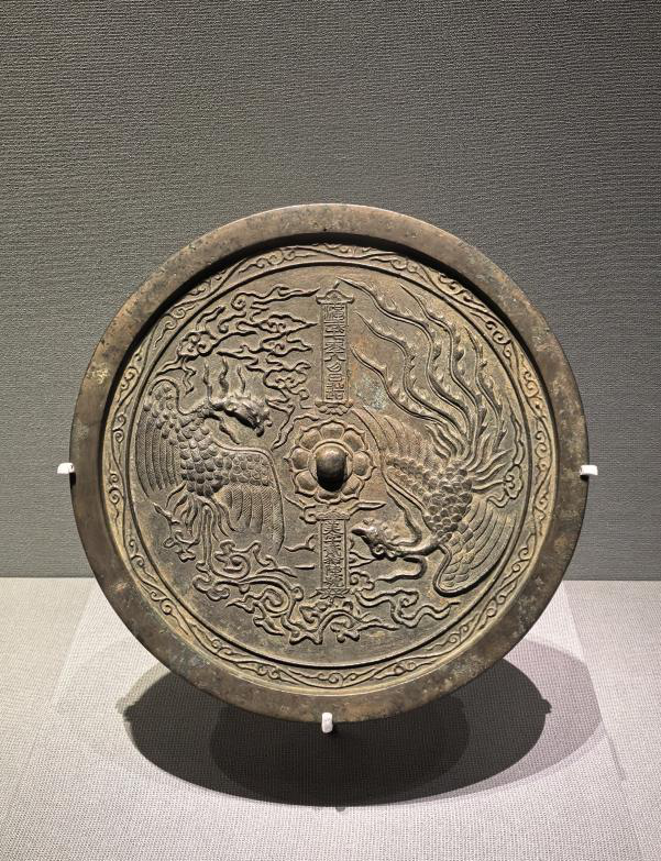 另一件双凤莲花钮铜镜同样极具故事感,与鲁王相关的物件一同展出时,更添温情。这面铜镜和朱元璋长女临安公主墓中的铜镜造型、纹饰高度相似,是明初朝廷为皇室女性定制的珍品。它以莲花为钮座,镜身刻有鸾凤相逐的图案,鸾凤展翅拖尾,在卷云纹衬托下尽显灵动。镜身还留有两行竖刻铭文,上方是篆书“洪武七年八月日造”,下方为楷书“美字贰拾陆号”,专家推测“美字”编号或是妃嫔专属标识,恰好契合戈妃的身份,也印证了明初皇室器物的等级规制。铜镜敦厚体重,纹饰富硕,线条优美,做工精湛,为明代铜镜中的上乘之作。