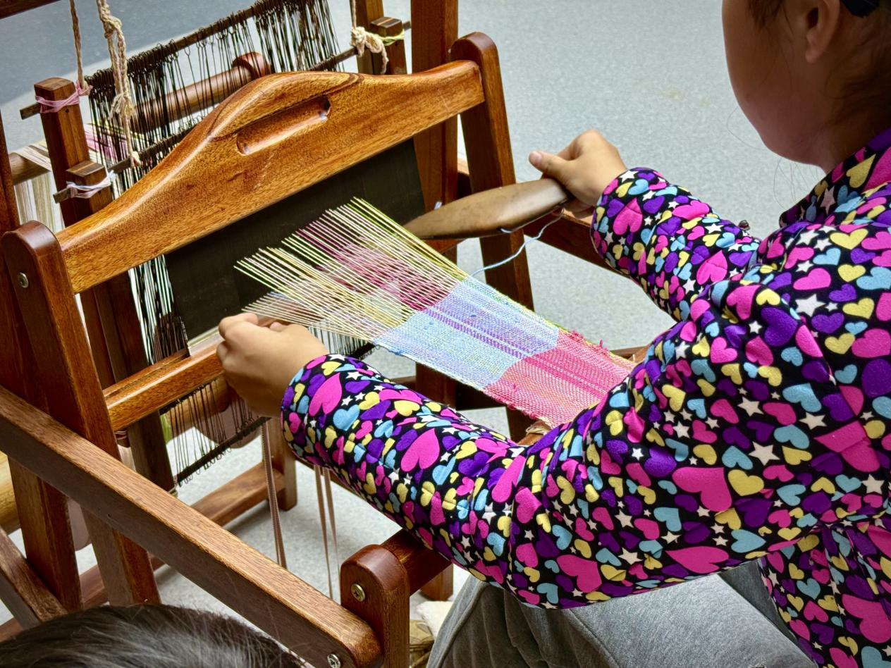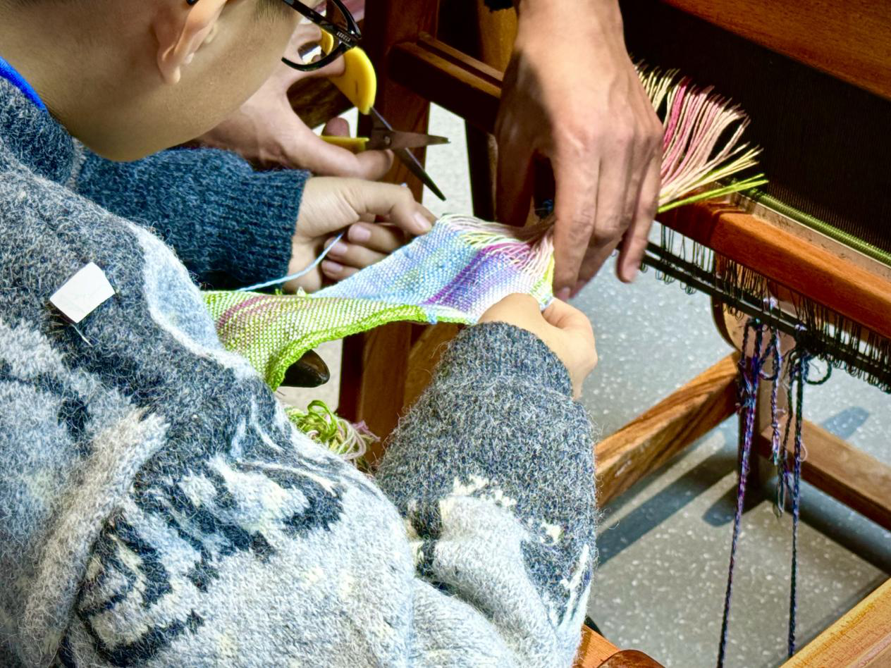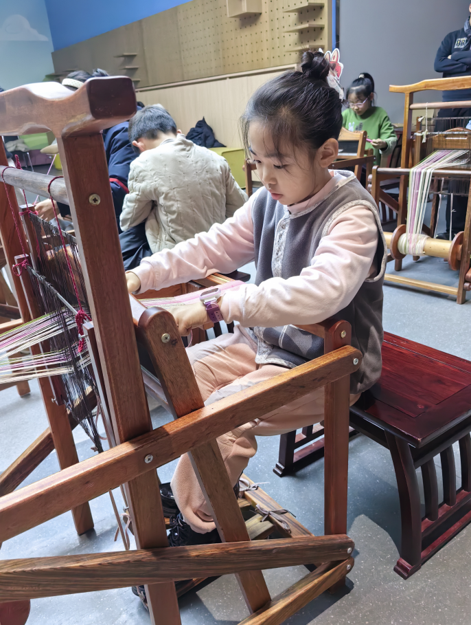 体验环节将活动推向高潮。在指导老师的示范下,古老的木质织机发出规律的“咔嗒”声,梭子在经纬间流畅穿梭。同学们分组进行简易织造体验,理经、引纬、打纬……看似简单的步骤却需要极大的耐心与协调。当五彩丝线在指尖逐渐形成织物肌理时,一推一拉之间,同学们真正体会到何为“匠心”,也明白了“丝丝皆辛苦”的含义。