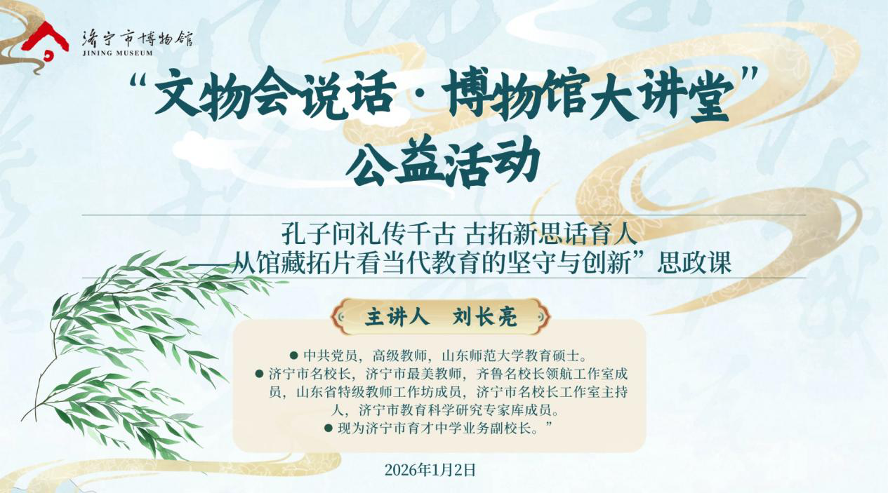 2026年1月2日 9:30-11:00,济宁市博物馆(文化中心馆)将重磅推出“文物会说话・博物馆大讲堂”公益活动,以“孔子问礼传千古,古拓新思话育人——从馆藏拓片看当代教育的坚守与创新”思政课为主题,邀请济宁市育才中学业务副校长刘长亮,带大家穿越两千年时光,解锁孔子的教育密码与思想世界,为学生团体及文化爱好者献上一场干货满满的文化盛宴!
