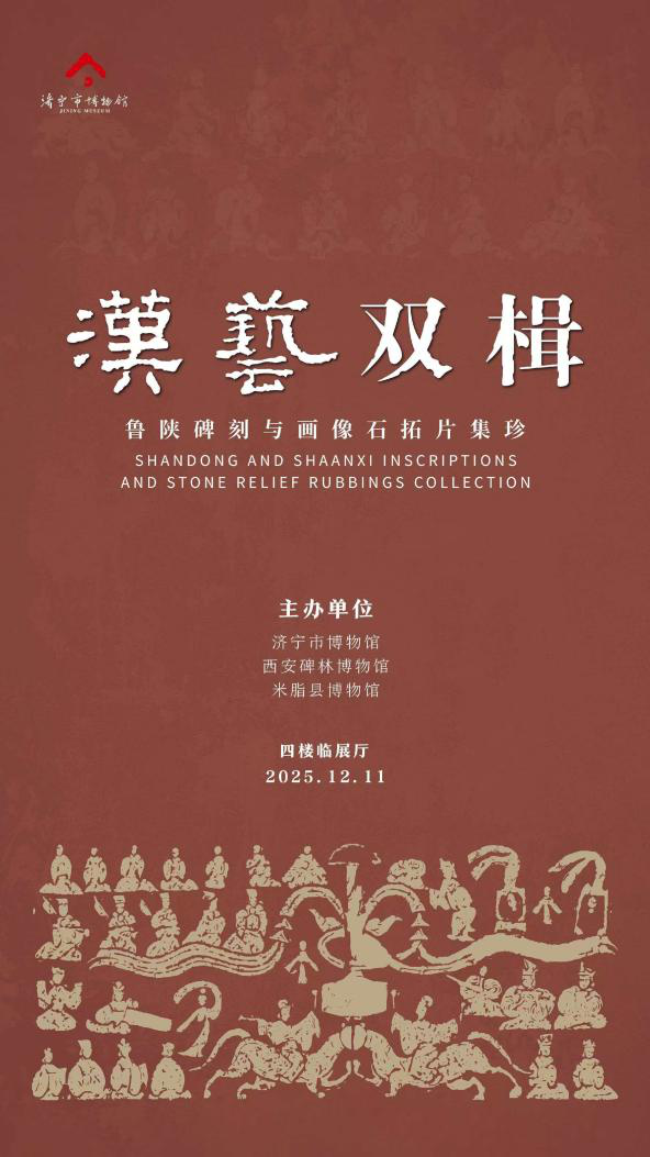 为贯彻落实习近平总书记关于加强文化遗产保护传承重要论述精神,展现汉代石刻艺术的雄浑气象与深厚底蕴,济宁市博物馆携手西安碑林博物馆、米脂县博物馆联合打造《汉艺双楫——鲁陕碑刻与画像石拓片集珍》。本次展览精选60余件来自三秦大地与齐鲁故地的汉碑及画像石拓片珍品,以“文字之碑”与“图像之石”为双翼,带观众共赴这场跨越千年的金石文化盛宴。