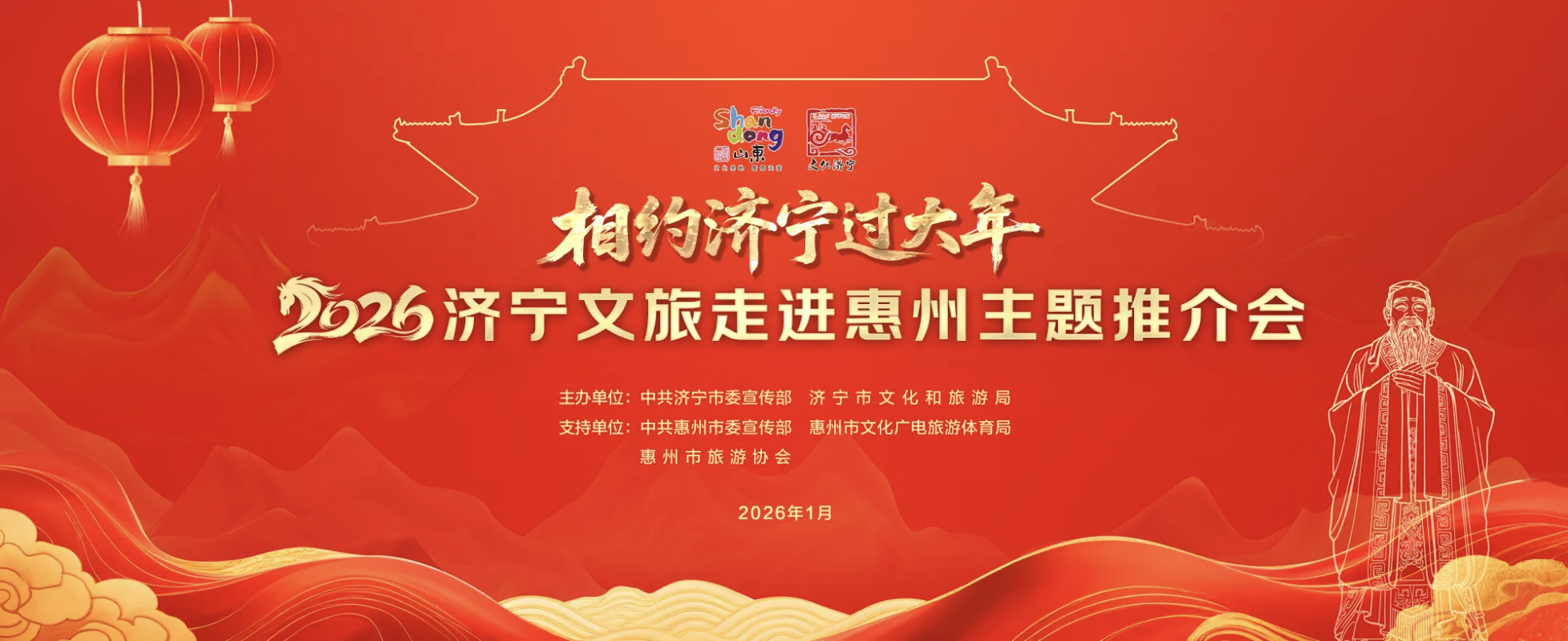 活动由中共济宁市委宣传部、济宁市文化和旅游局共同主办,并得到了中共惠州市委宣传部、惠州市文化广电旅游体育局、惠州市旅游协会的大力支持。济宁市委常委、宣传部部长董冰倾情推介济宁文旅之美,惠州市政府副市长段致辉热情回应两地合作愿景,济宁市政府副市长李丽主持政务环节。两地文旅业界代表近200人齐聚一堂,共襄盛会、共叙情谊、共商合作、共迎新春,见证了这场跨越地域的文化邂逅。